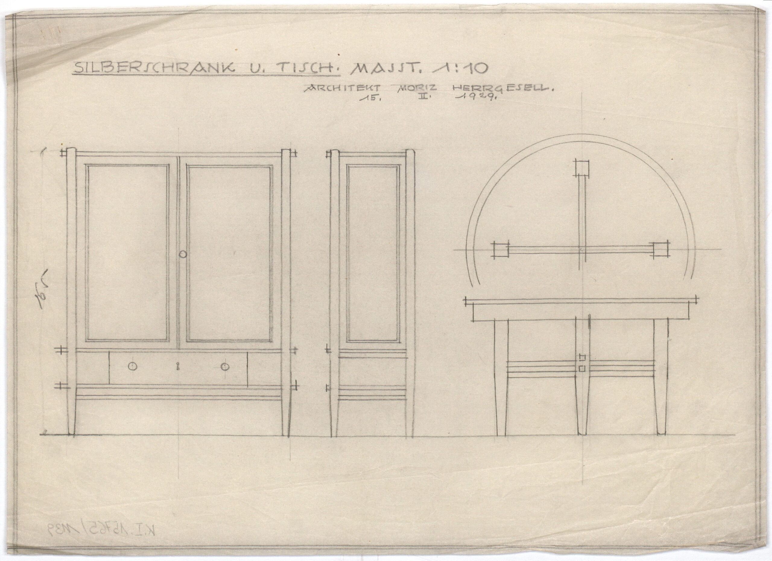 - Text am Objekt: Silberschrank und Tisch / Architekt Moriz Herrgesell / 15. II. 1929