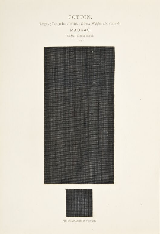 - Text am Objekt: SILK. / Length, 3 Yds. 19 ½ Ins.; Width, 22 Ins.; Weight, 8 OZ. 4 dr. / LAHOR. / NO. 557, SECOND SERIES. / "11618" / FOR EXAMINATION OF TEXTURE