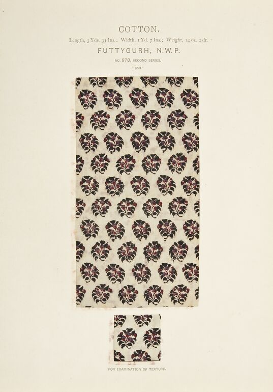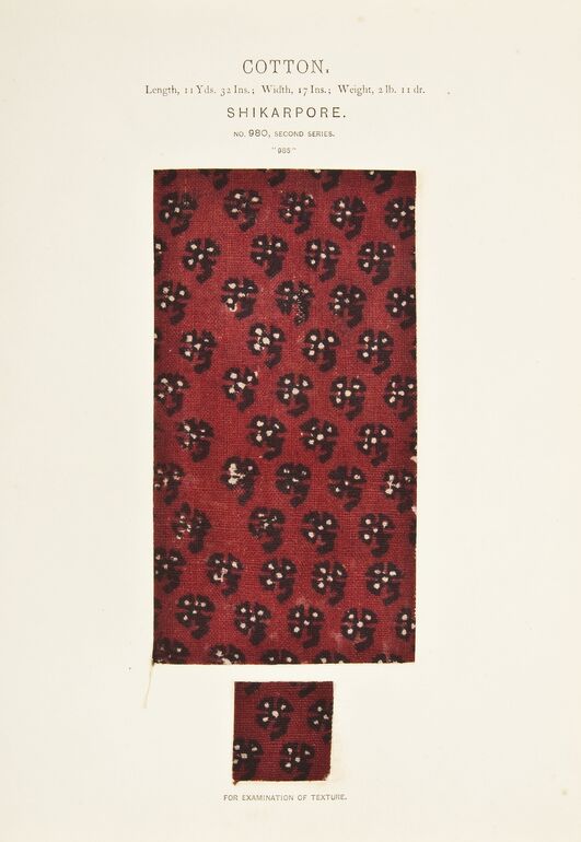- Text am Objekt: SILK. / Length, 5 Yds. 15 Ins.; Width, 32 Ins.; Weight, 13 OZ. 5 dr. / BHAWULPORE. / NO. 573, SECOND SERIES. / "3712" / FOR EXAMINATION OF TEXTURE