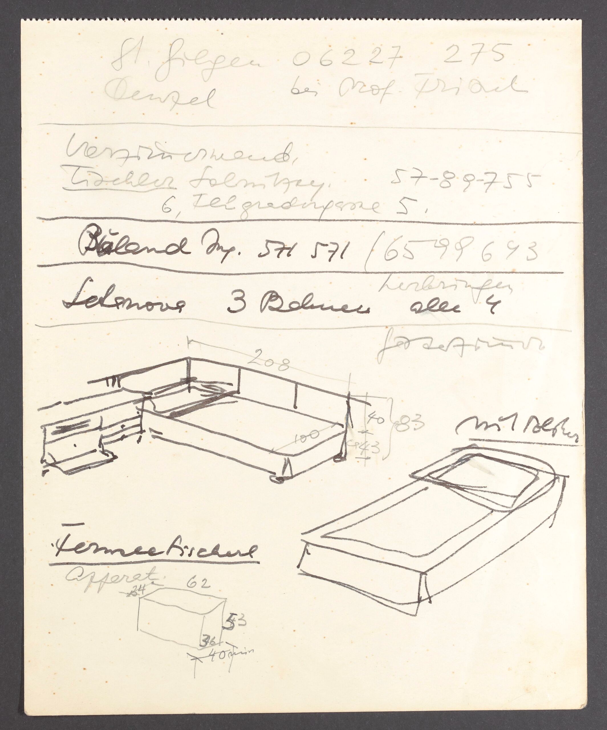Skizze, Skizze eines Bettes, Anna-Lülja Praun, MAK Inv.nr. KI 16475-18-21-1-3