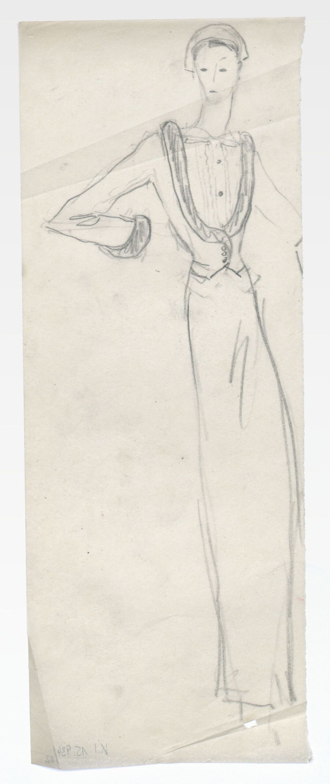 Modeentwurf, Skizze eines Kleids mit Weste, Ernst Deutsch-Dryden, MAK Inv.nr. KI 15934-42