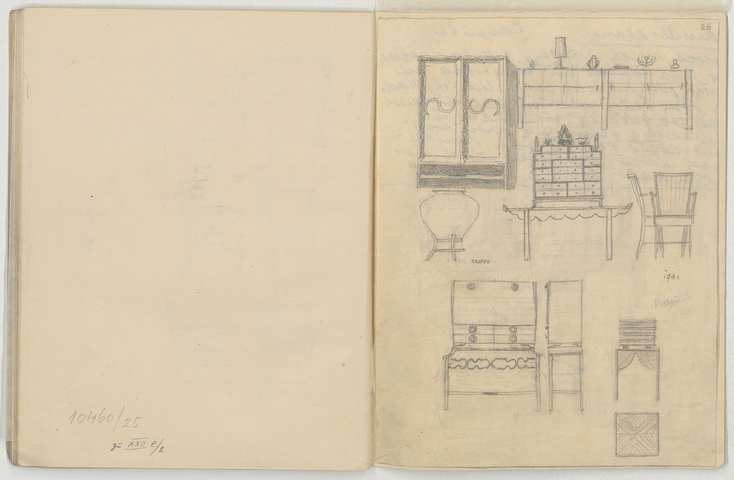 Skizze, Skizzen zu einem Schrank, zu Anrichten, einem Kästchen, einem Tischchen und Stühlen, Viktor Lurje, MAK Inv.nr. KI 10460-2-26
