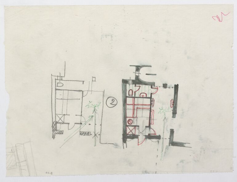 Skizze, Skizzenhafter Grundriss von dem westlichen Abschnitt beziehungsweise alternativen Abschnitt des Zwillinghauses, Anna-Lülja Praun, MAK Inv.nr. KI 16475-8-456