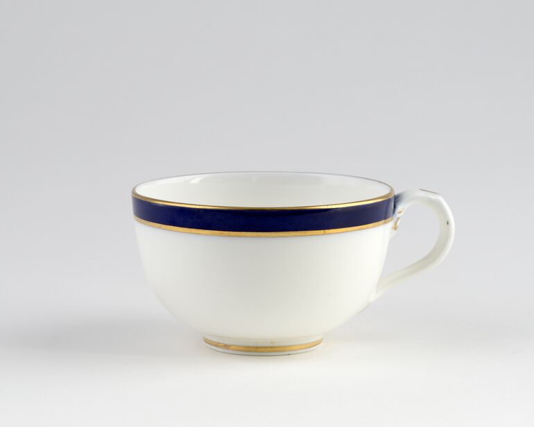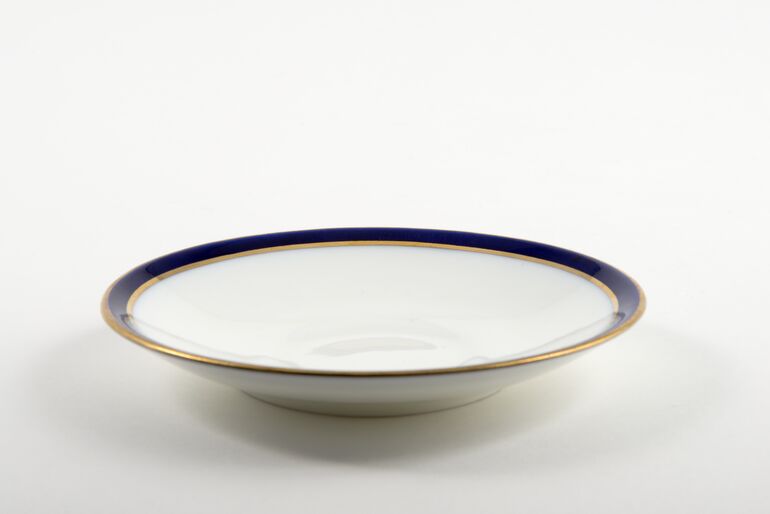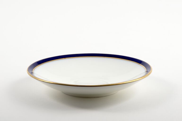 Speiseteller mit breitem kobaltblauem Rand und zwei Goldrändern auf der Fahne