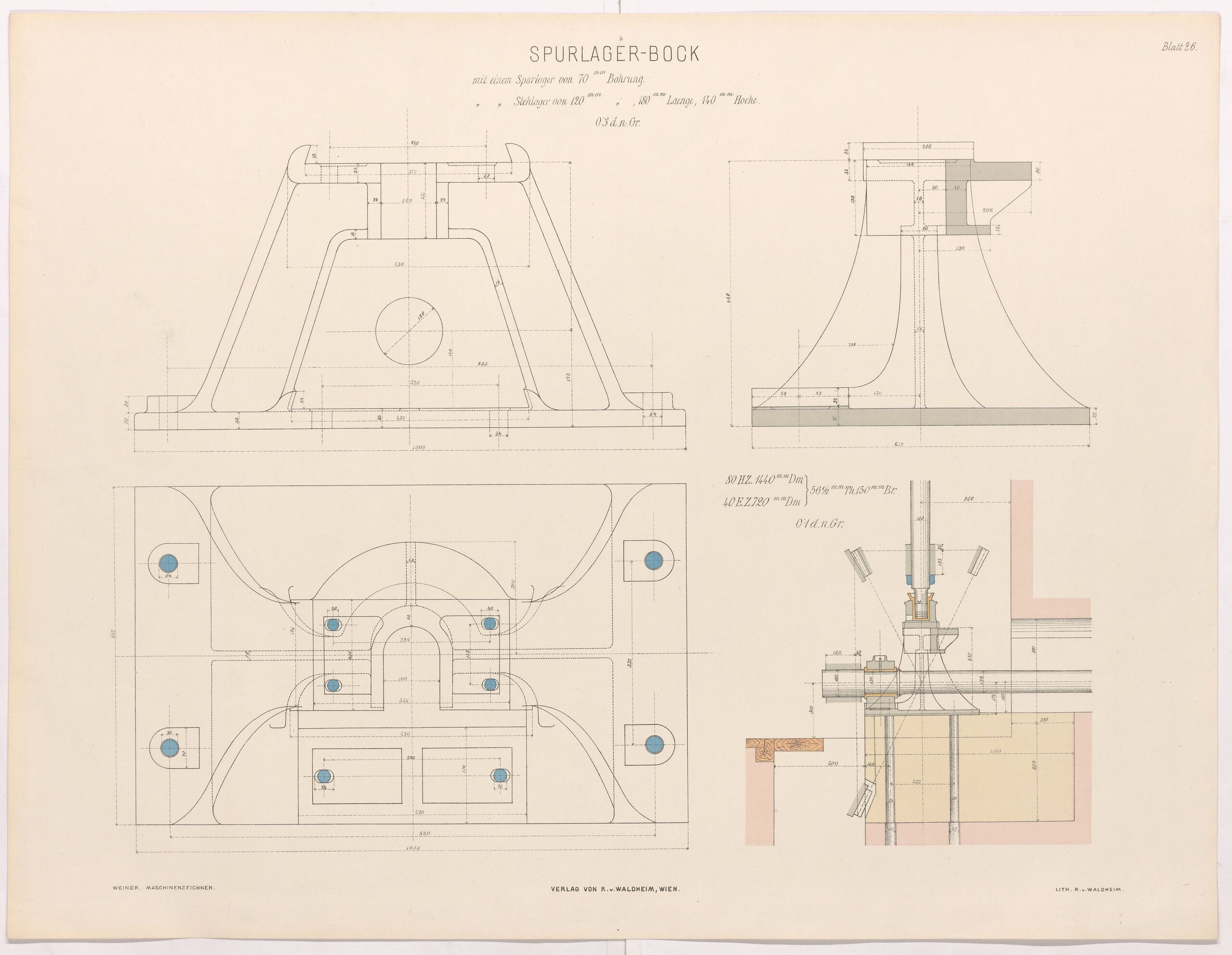 - Text am Objekt: Blatt 26; Spurlager-bock / [...] / 0.3 d. n. Gr.; Verlag von R. v. Waldheim in Wien.; WEINER, MASCHINENZEICHNEN; LITH v. R. v. WALDHEIM.