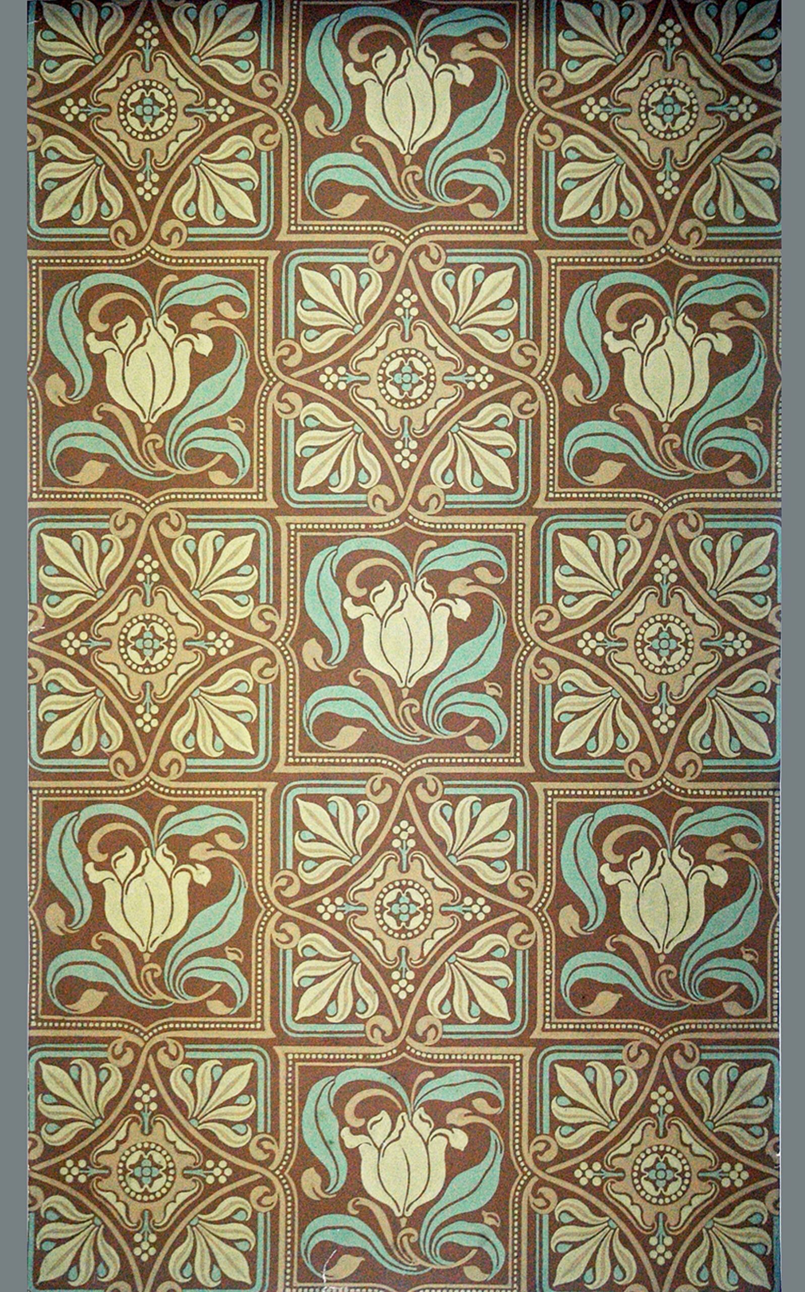 - Alternierend Blatt-Rautenformen und tulpenartige Blüten in Quadraten, auf dunkelbraunem Grund (deskriptiver Titel)