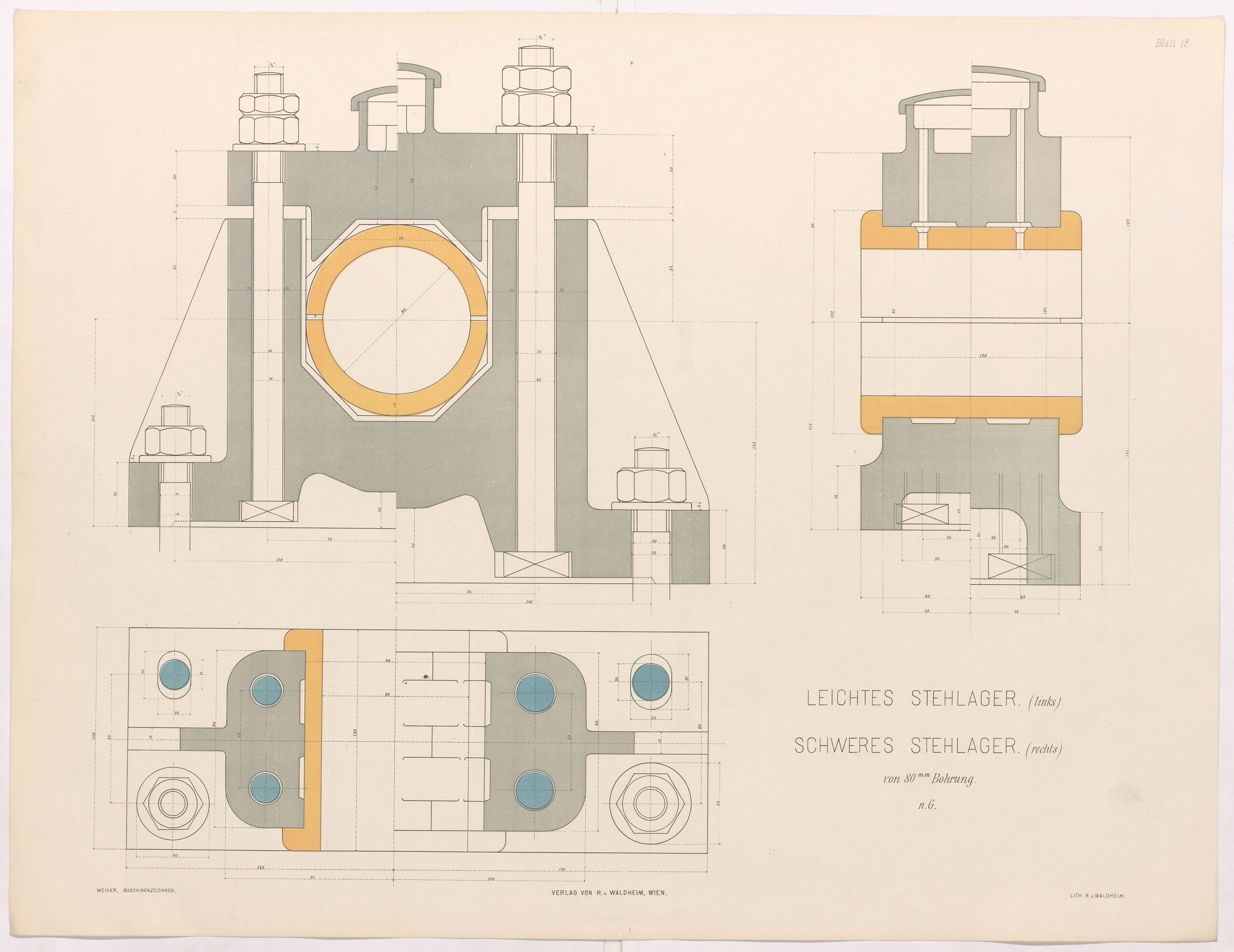 - Text am Objekt: Blatt 12; leichtes Stehlager (links) / schweres Stehlager (rechts) / von 80 mm Bohrung. / n. G.; Verlag von R. v. Waldheim in Wien.; WEINER, MASCHINENZEICHNEN; LITH v. R. v. WALDHEIM.