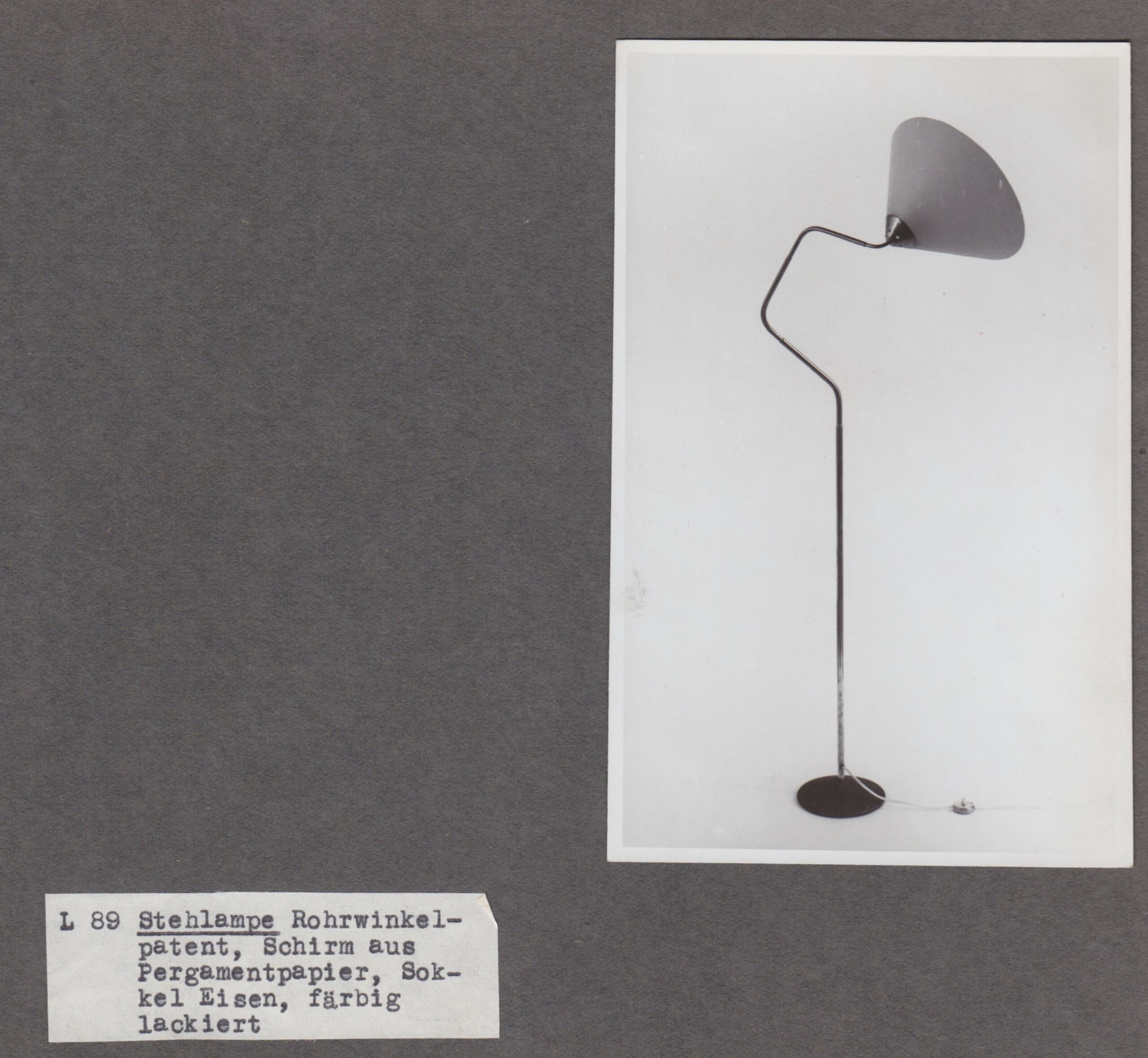 - Text: Stehlampe, Rohrwinkel-/patent, Schirm aus/Pergamentpapier, Sok-/kel Eisen, färbig/lackiert