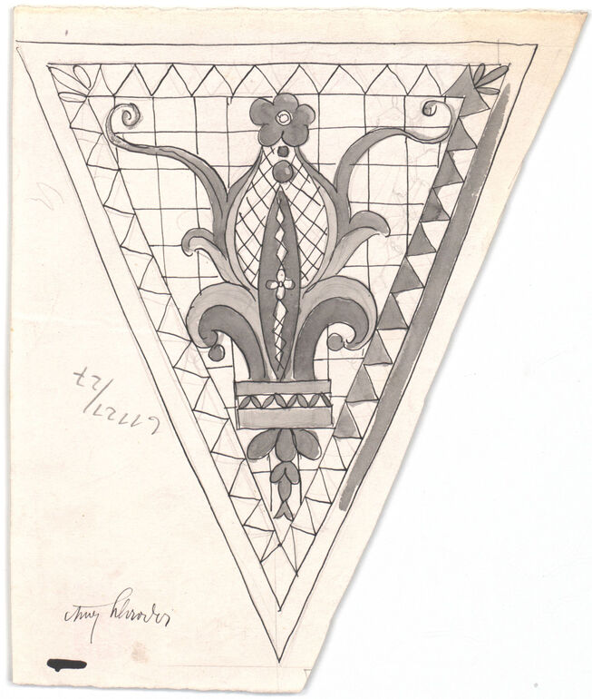 - Stilkopie eines Grisaille-Ornaments eines Glasfensters aus dem Dom zu Altenburg bei Köln. Kreisförmig, ineinander verwobene Blattranken, stilisierte Weinblätter und Trauben (vom Bearbeiter vergebener Titel)