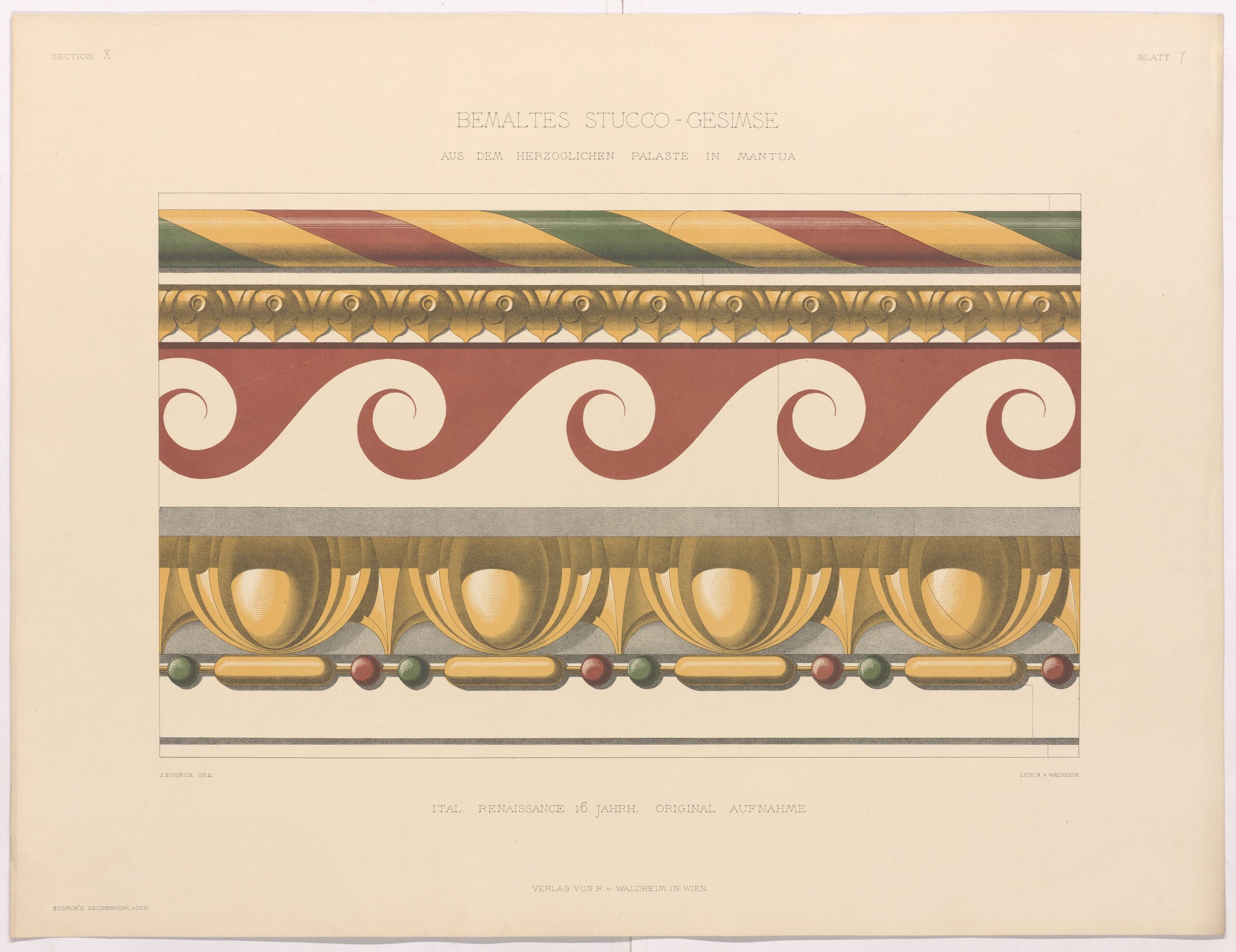 - Text am Objekt: SECTION X; BLATT 7; BEMALTES STUCCO-GESIMSE / AUS DEM HERZOGLICHEN PALASTE IN MANTUA.; ITAL. RENAISSANCE 16. JAHRH. ORIGINAL AUFNAHME; J. STORCK GEZ.; LITH. R. V. WALDHEIM; ORIGINAL-COMPOSITION VON PROF. STORCK.; VERLAG VON R. V. WALDHEIM; STORCK'S ZEICHENVORLAGEN.