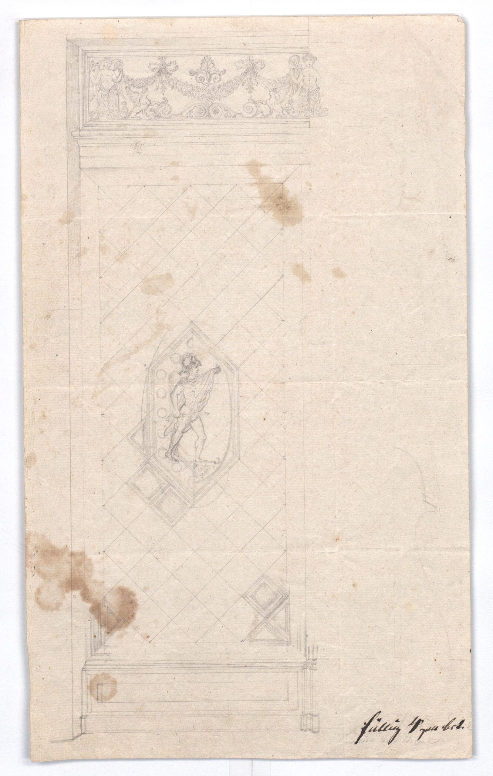 Studie zu einem Wandabschnitt mit gekachelter Zone über profiliertem Sockel sowie mit einem Fries mit Grottesken über dem Gesims als Abschluß nach oben. Im Mittelteil ist ein alternierendes Bildfeld mit antikisierendem Krieger dargestellt. Auf dem Verso befinden sich zudem weitere Bleistiftskizzen.