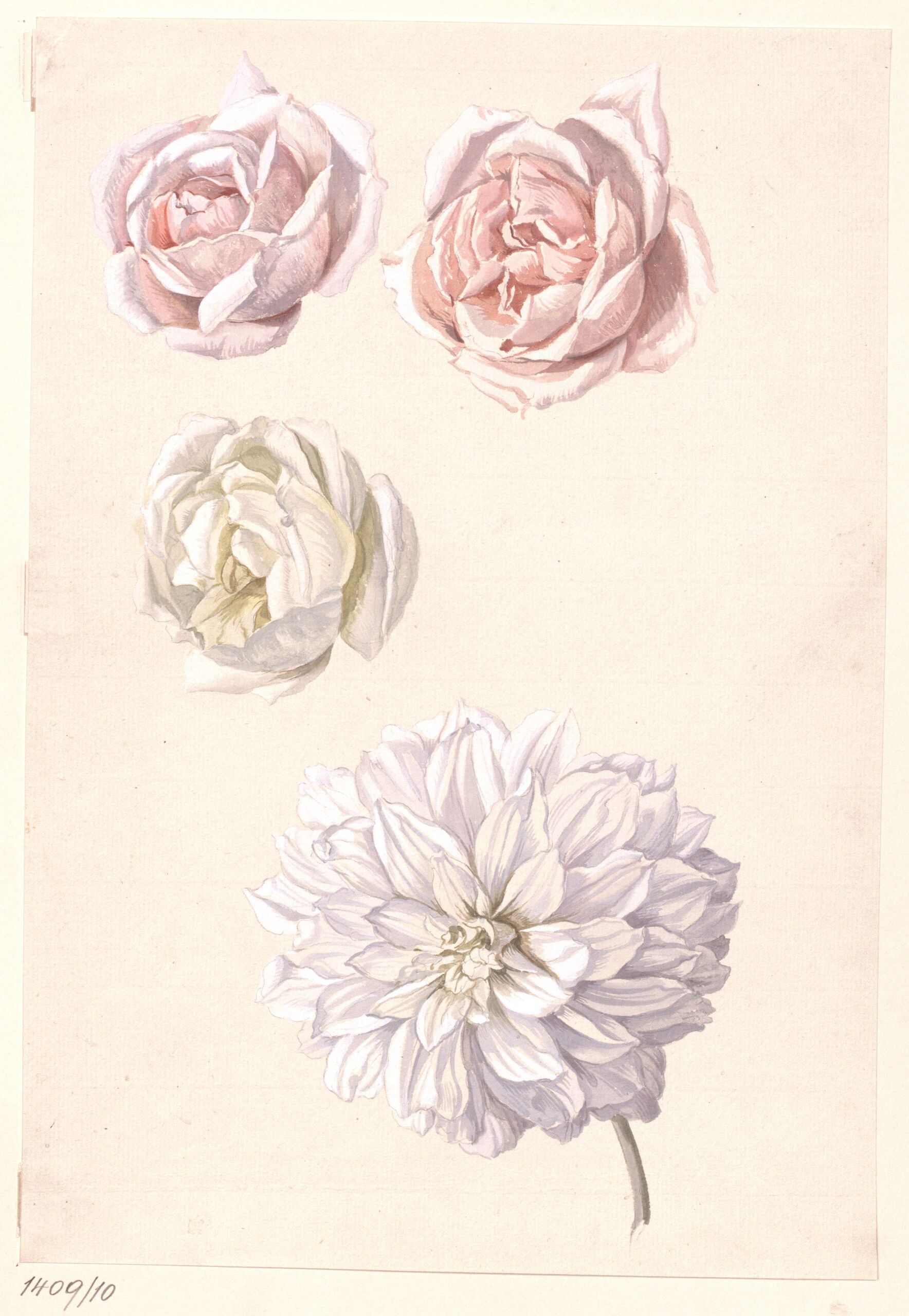 Blumendarstellung, Studien zu Rosenblüten und einer Chrysantheme, Sebastian Wegmayr, MAK Inv.nr. KI 1409-10