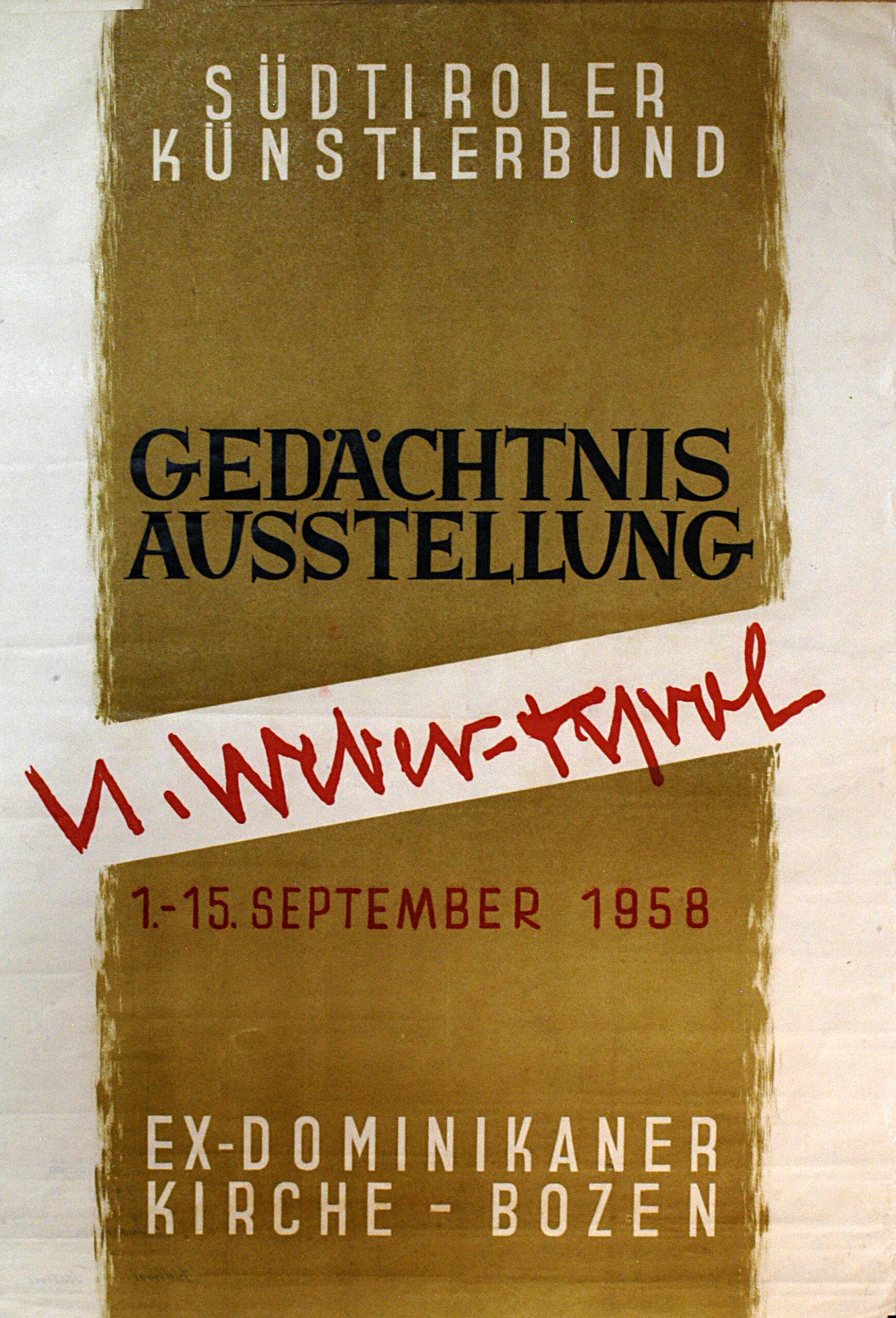 - Text am Objekt: Südtiroler Künstlerbund. Gedächtnisausstellung. N. Weber - Tyrol. 1.- 15. September 1958. Ex - Dominikaner Kirche Bozen