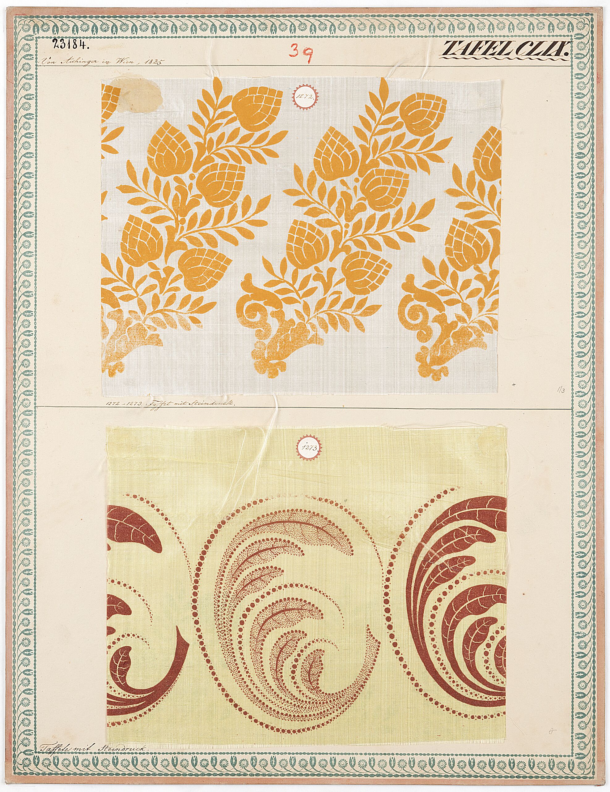 - Beschriftung (Vorderseite) : Von Aichinger in Wien, 1825. / Taffete mit Steindruck.