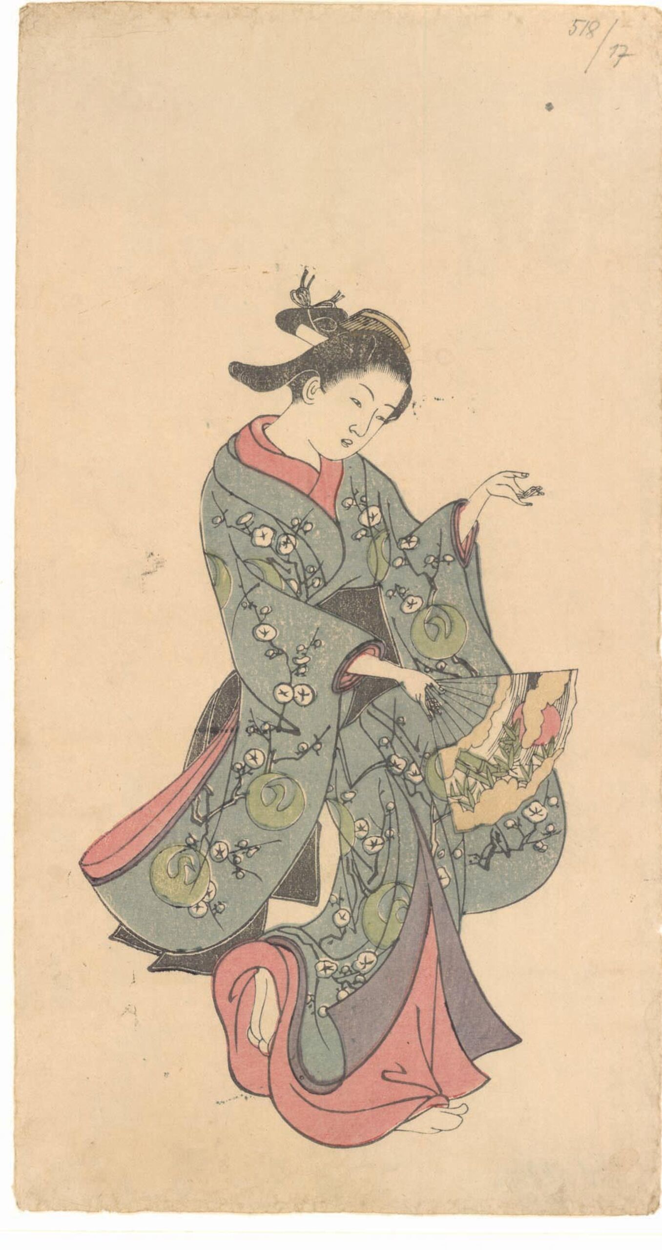 Bilder aus dem Buch “Bilderbuch vom Asaka-Berg (Ehon Asakayama 絵本浅香山), das Sukenobu 1739 als Schwarz/Weiß-Druck (sumizuri 墨摺) anfertigte. Die Blätter hier wurden später als Einzelblätter färbig nachgedruckt. Tanzende Frau mit einem Faltfächer. Auf ihrem Kimono Pflaumenblüten und Kraniche in Kreisform.