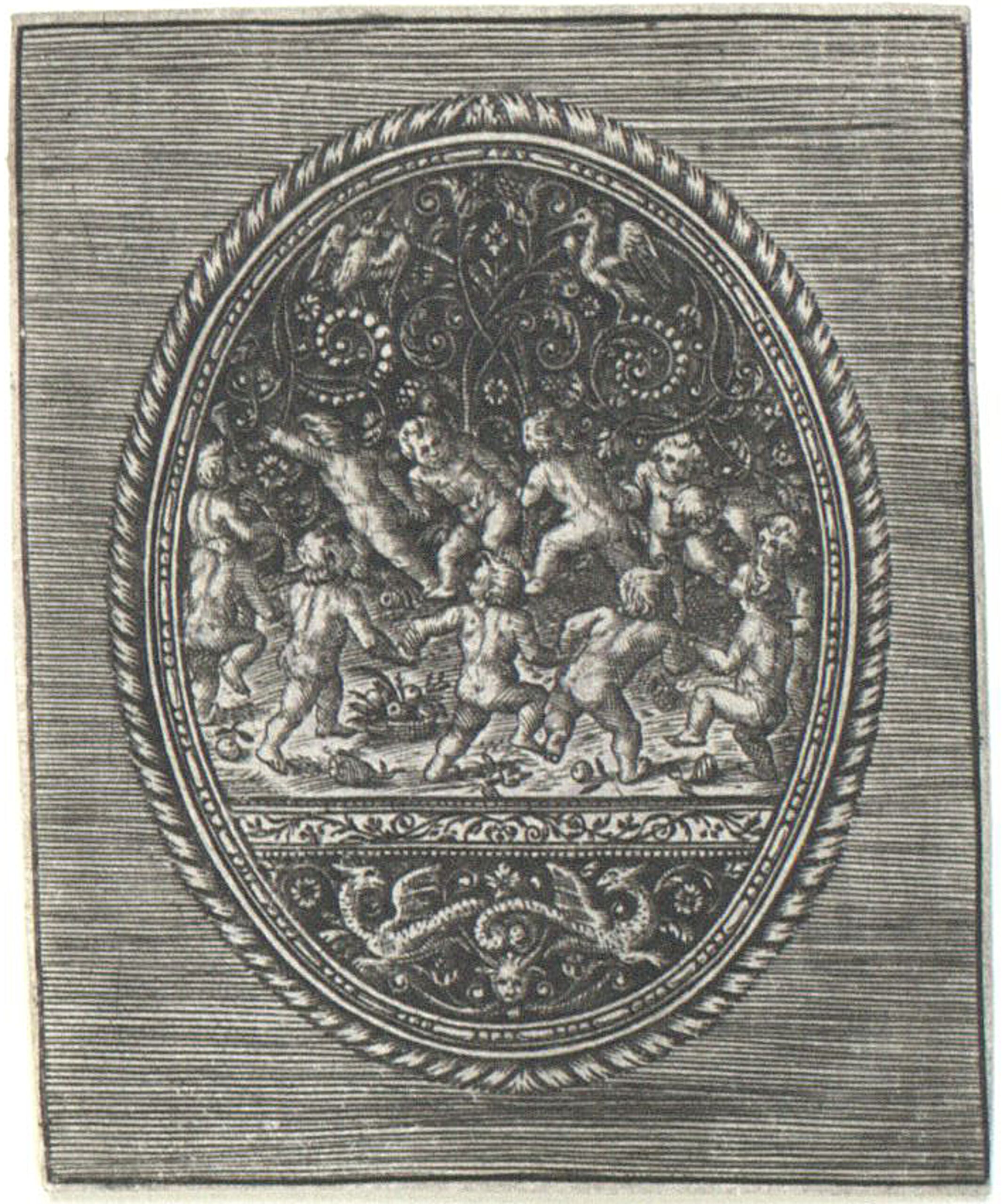 Ornamentstich, Tanzende Kinder in einem Oval auf schraffiertem Hintergrund, Blatt aus einer Folge von Uhrendeckel, von Schestag vormals van den Hecken zugeschrieben, Antoine Jacquard, MAK Inv.nr. KI 5781-6