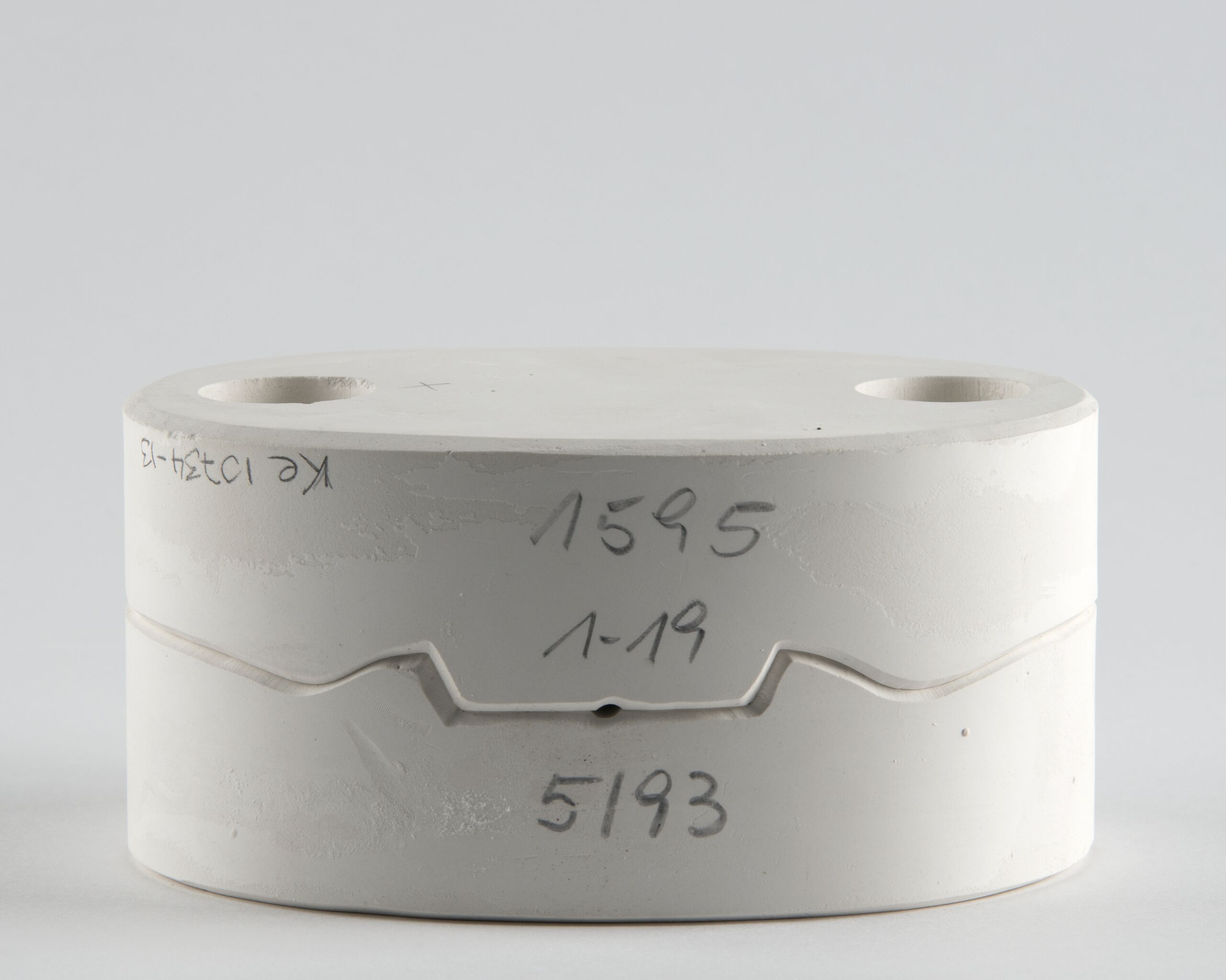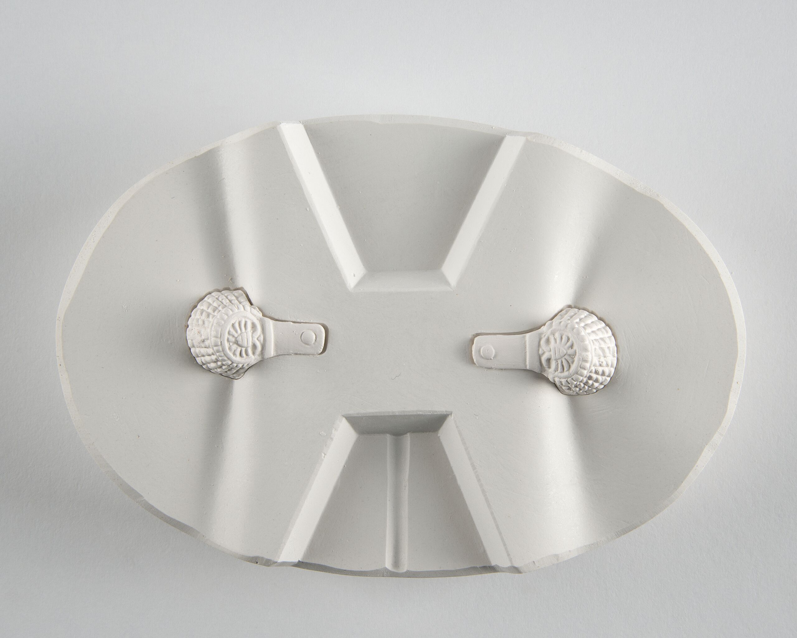 zur Herstellung einer Reiterfigur "Courbette" (Figur 1595, Entwurf Albin Döbrich 1925): Gipsform: Schulterklappen (Guß-schritt x von 1-19 Formen) Zweiteilige Arbeitsform aus Gips mit 4 Keilen, mit den aus Porzellan gegossene Teilen, ungebrannt