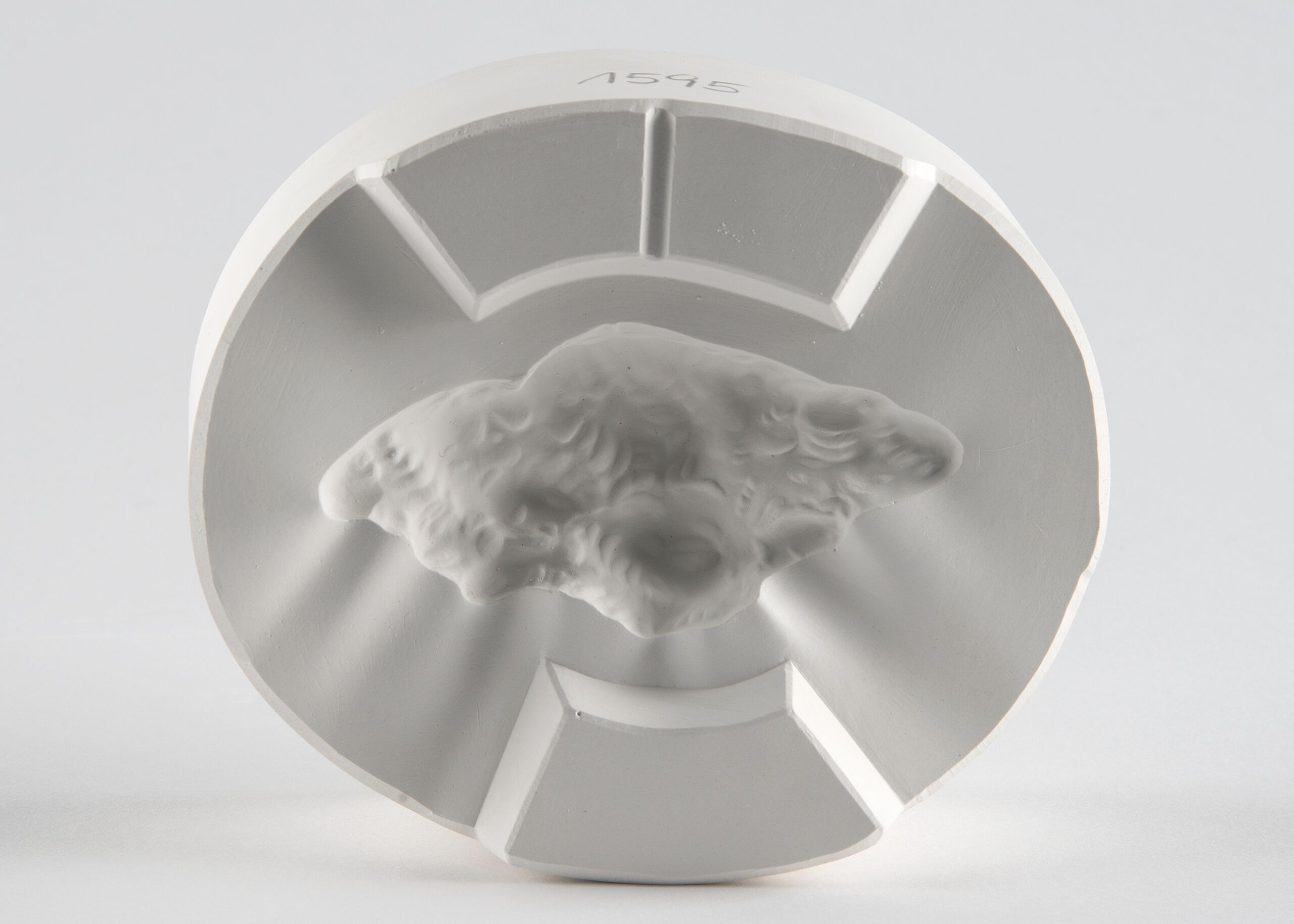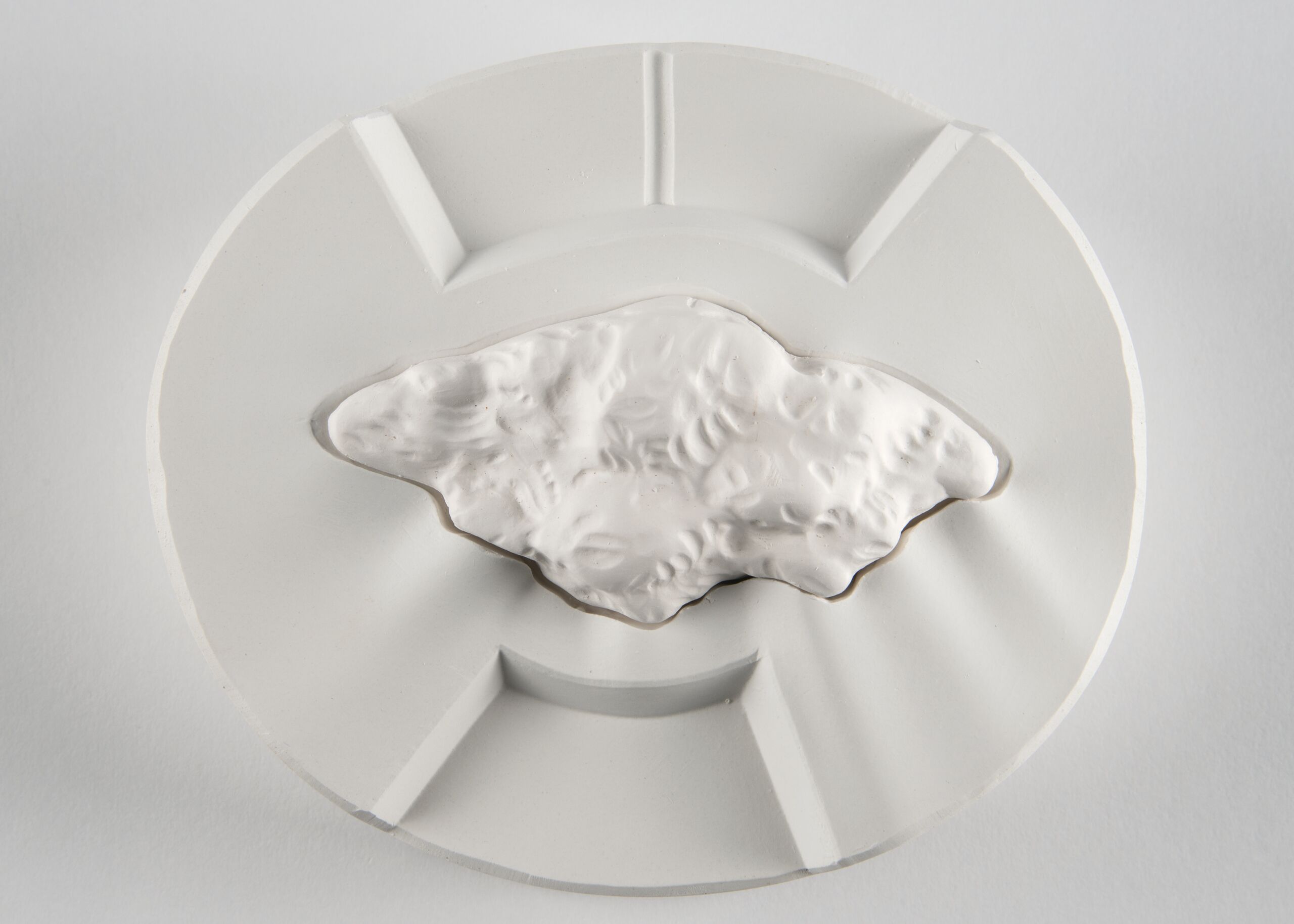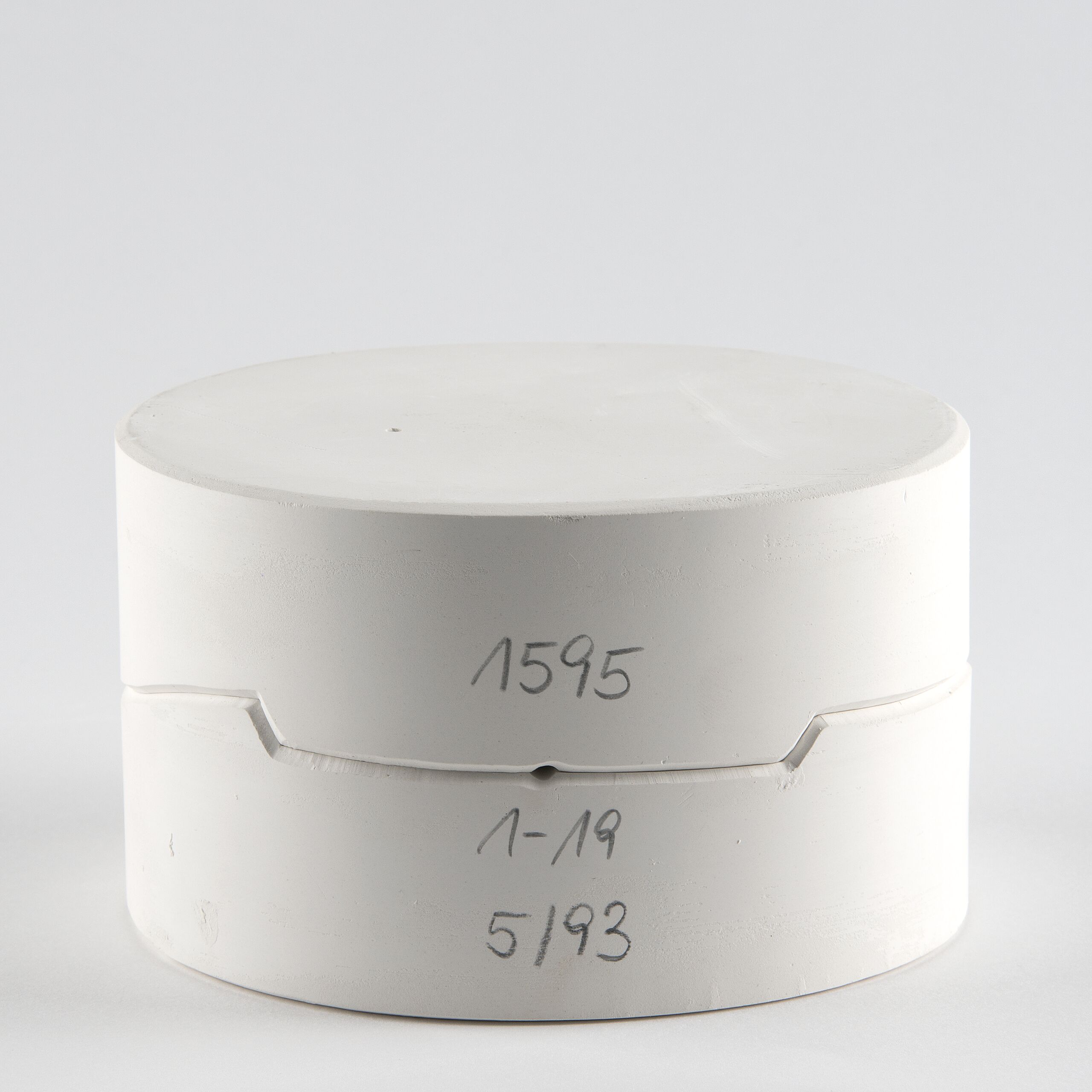Zweiteilige Arbeitsform aus Gips ohne Keile, mit den aus Porzellan gegossene Teilen, ungebrannt