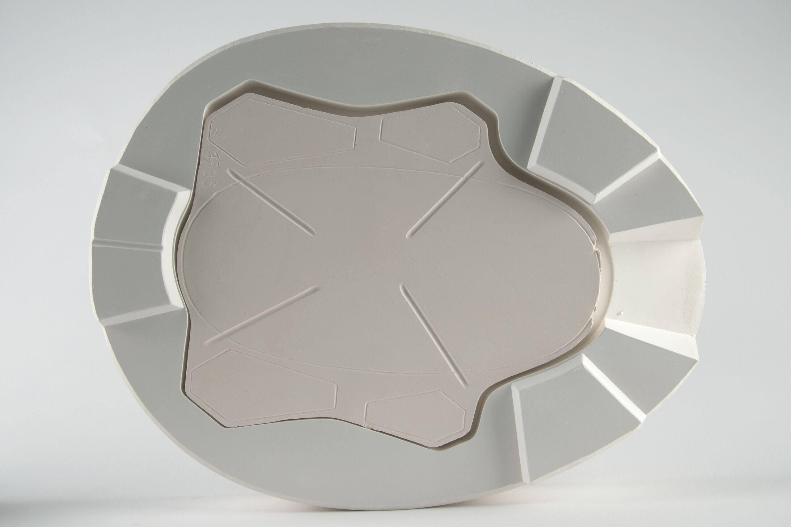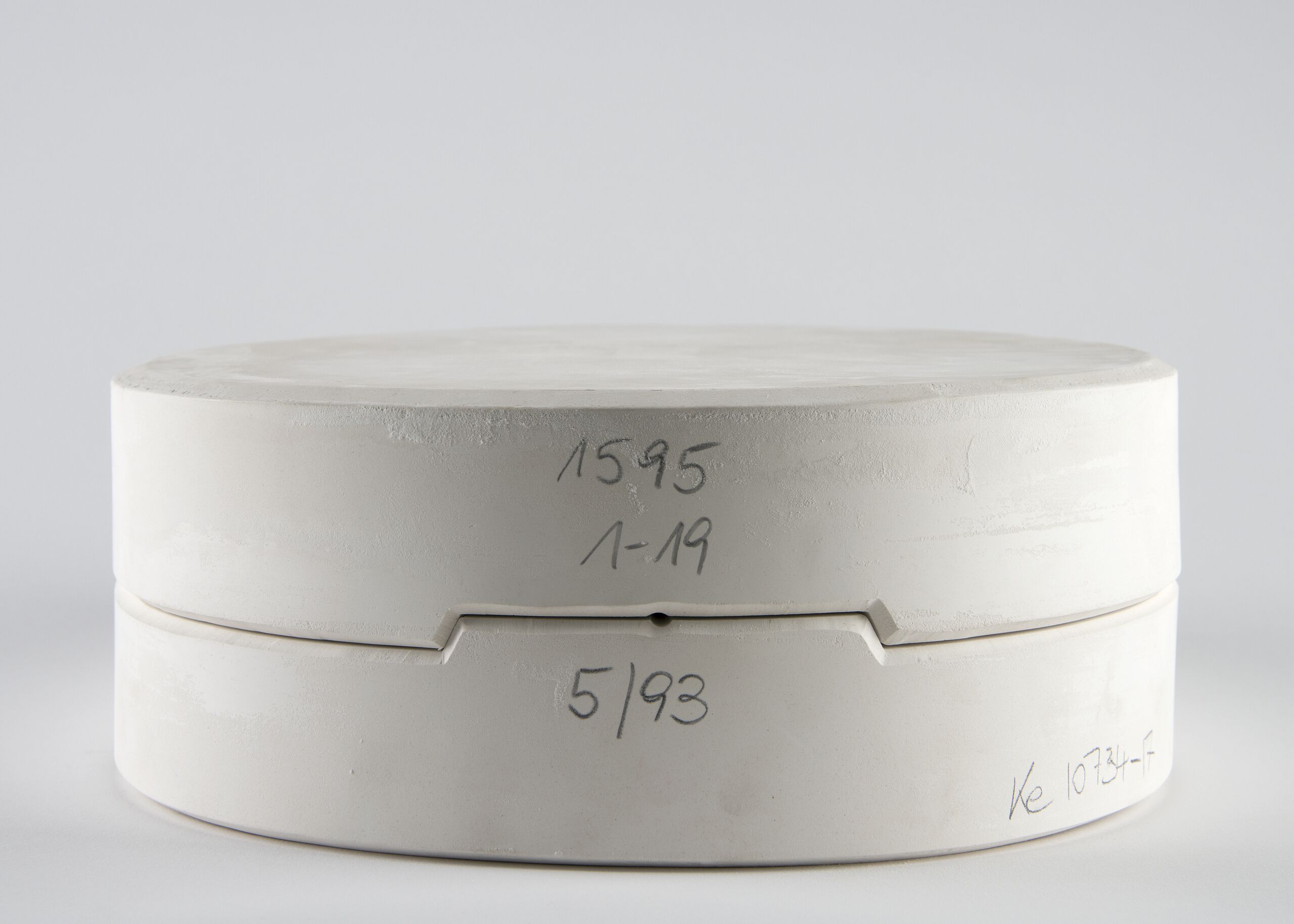 zur Herstellung einer Reiterfigur "Courbette" (Figur 1595, Entwurf Albin Döbrich 1925): Gipsform: Bomse / Platte-Unterlage für die aufgebaute Figur (Guß-schritt 1 von 1-19 Formen) Zweiteilige Arbeitsform aus Gips ohne Keile, mit den aus Porzellan gegossene Teilen, ungebrannt
