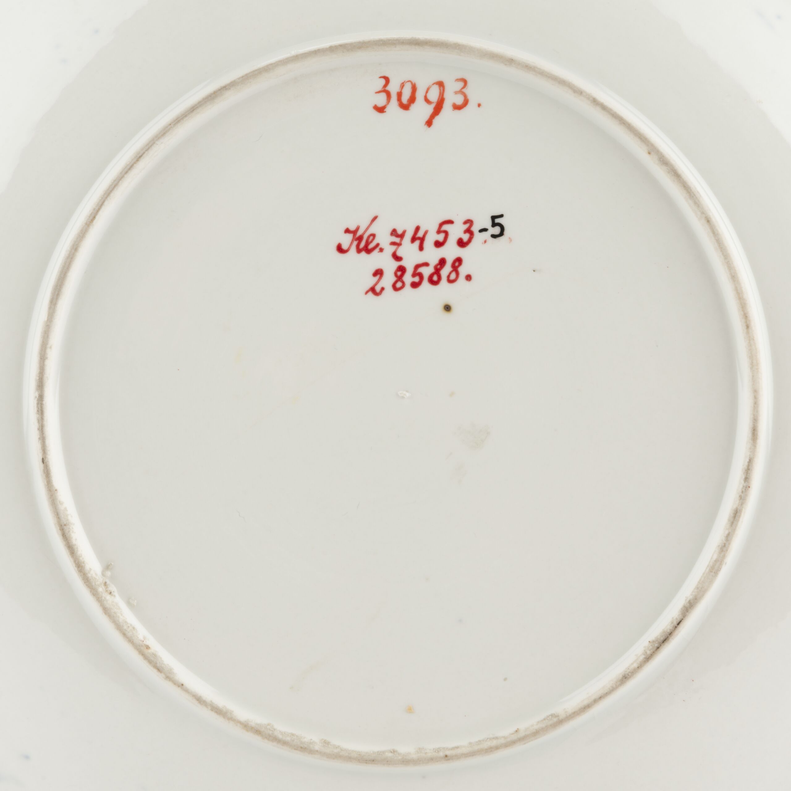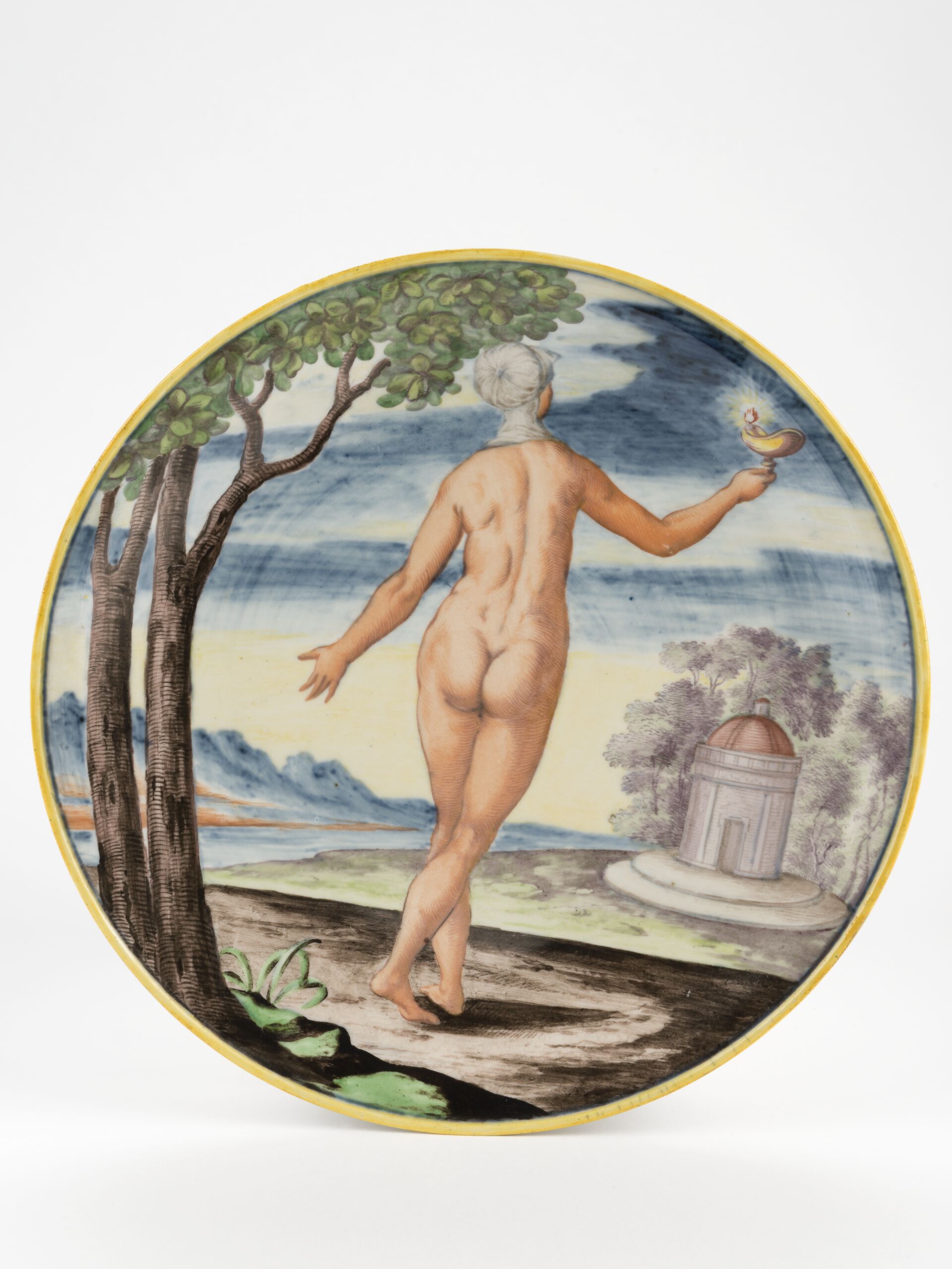 Teller mit farbigem Dekor nach Majolika-Art, nackte Frau mit Lampe in einer Landschaft mit Fluß und Rundtempel