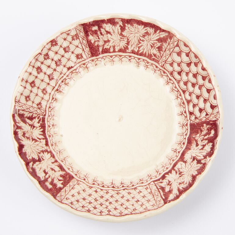 Englisches Sevice, Stoke on Trent, W.T.Copeland, beigefarbener Scherben, gewellte Wandung, transparent glasiert mit rotem Transferdruck-Dekor