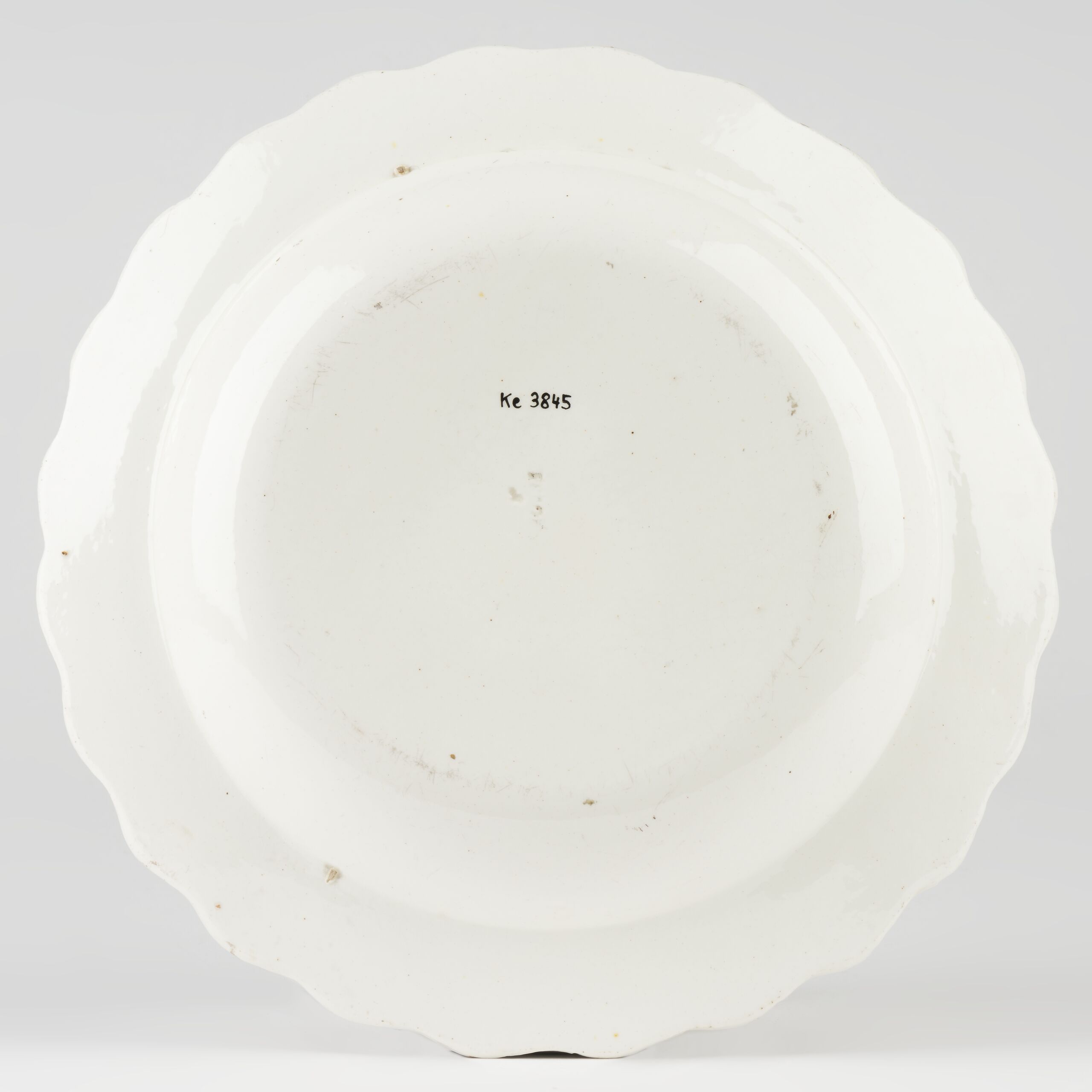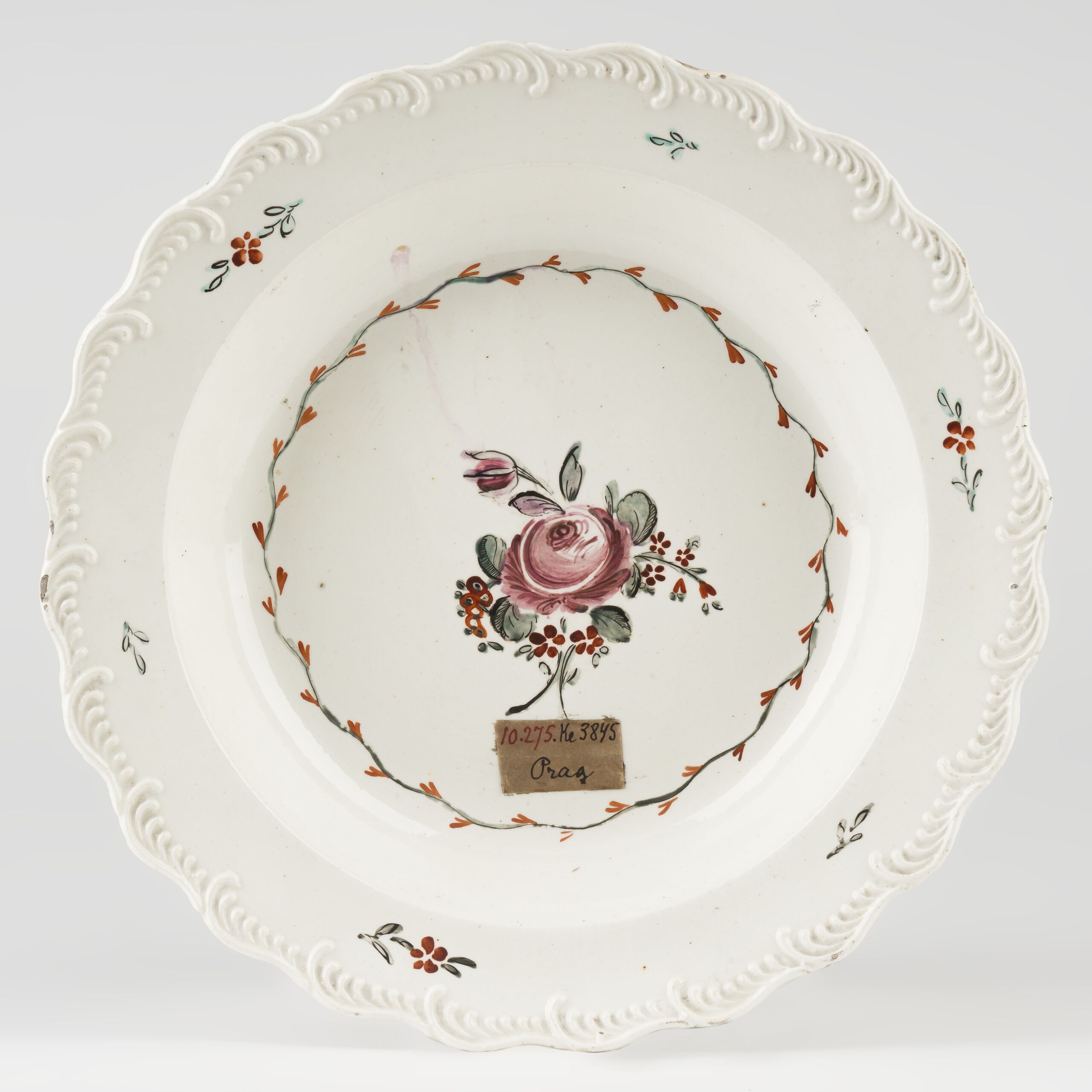 Teller mit geschweiftem Rand, reliefierter Fahne und bunt bemalten Streublumen auf der Fahne, Blättchenbordüre in der Kehle und Rosenbukett im Spiegel