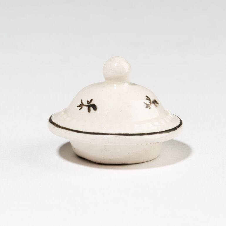 Deckelterrine mit gewellter, kannelierter Wandung, mit Blau und Eisenrot bemalt, kannelierter, hochgewölbter Deckel mit großem, blaugehöhtem Ananasknauf, der auf drei Blättern ruht