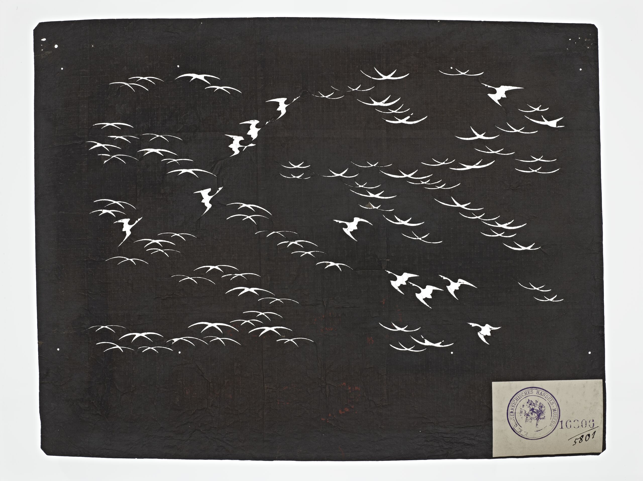 Färbeschablone (Katagami 型紙), Tiermuster (dōbutsu monyō 動物文様), Pflanzenmuster (shokubutsu monyō 植物文様): über Gräser fliegende Graugänse, Anonym, MAK Inv.nr. OR 3925-5801
