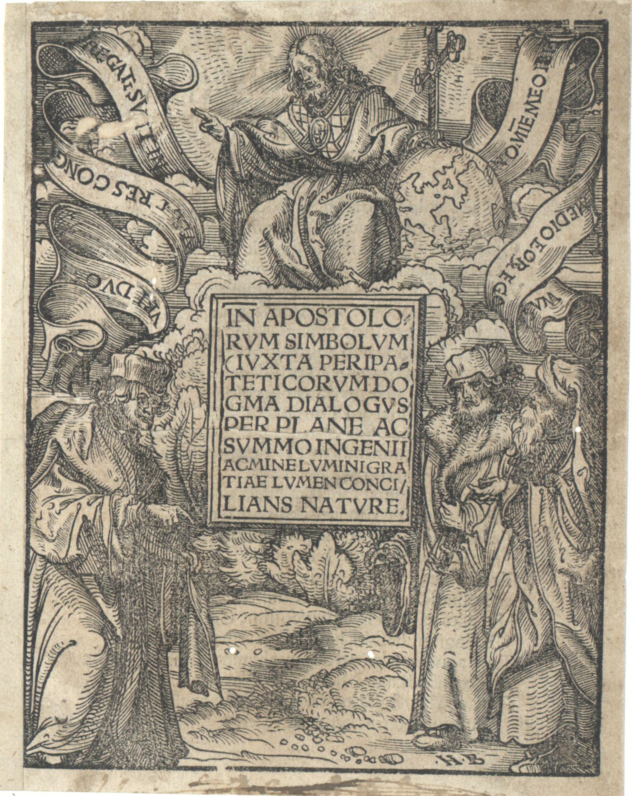 - Text am Objekt: IN APOSTOLO=/ RUM SIMBOLUM/ IUXTA PERIPA=/ TETICORUM DO/ GMA DIALOGUS/ PER PLANE AC/ SUMMO INGENII/ ACMINELUMINIGRA/ TIAE LUMEN CONCI/ LIANS NATURE. / ... / Monogramm HB