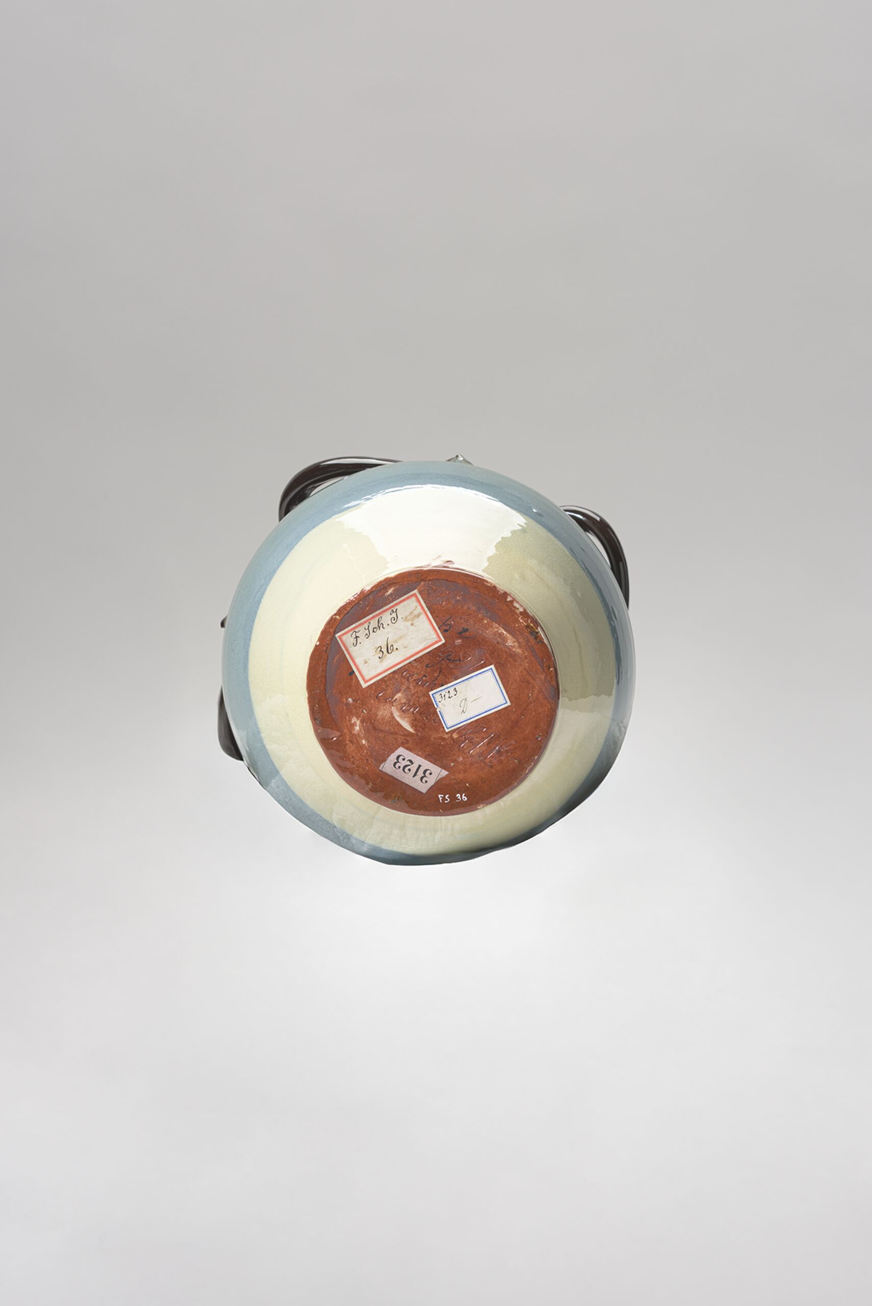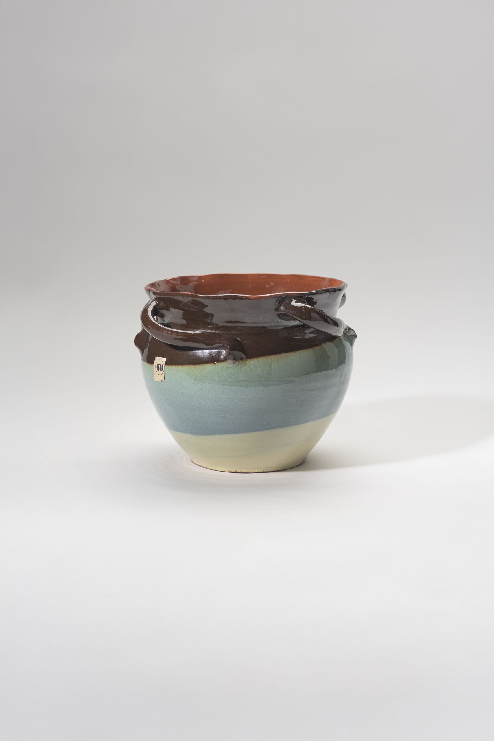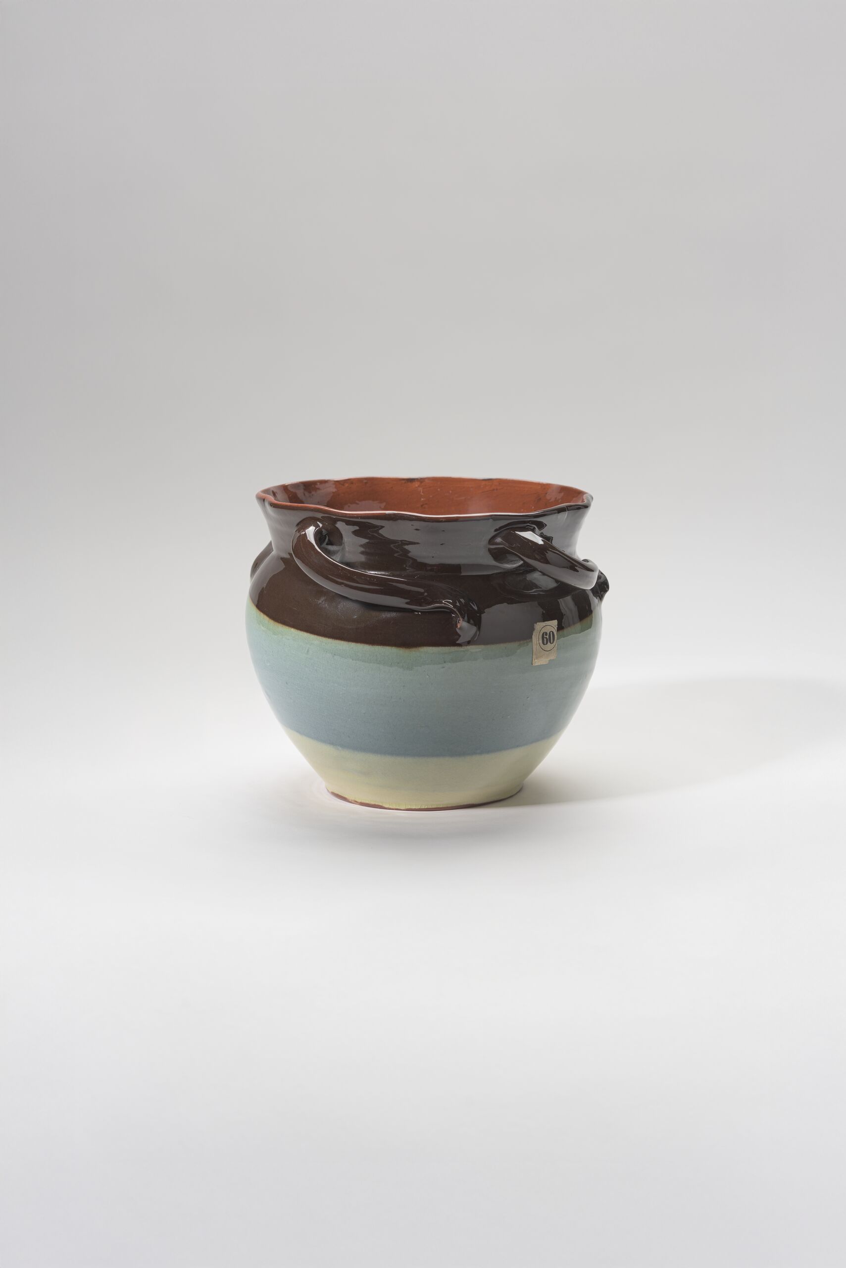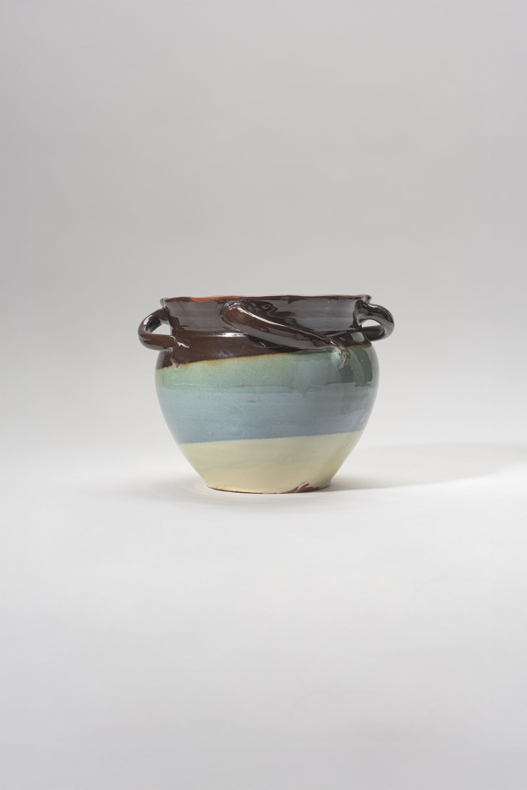 Topf mit vier Henkel, getöpfert, Ton, roter Scherben, innen rot (Scherben!?), außen in 3 Bahnen gelb, mittelblau und metallisch-braun dekoriert (eventuell Engobe) und dann glänzend glasiert (craq.)