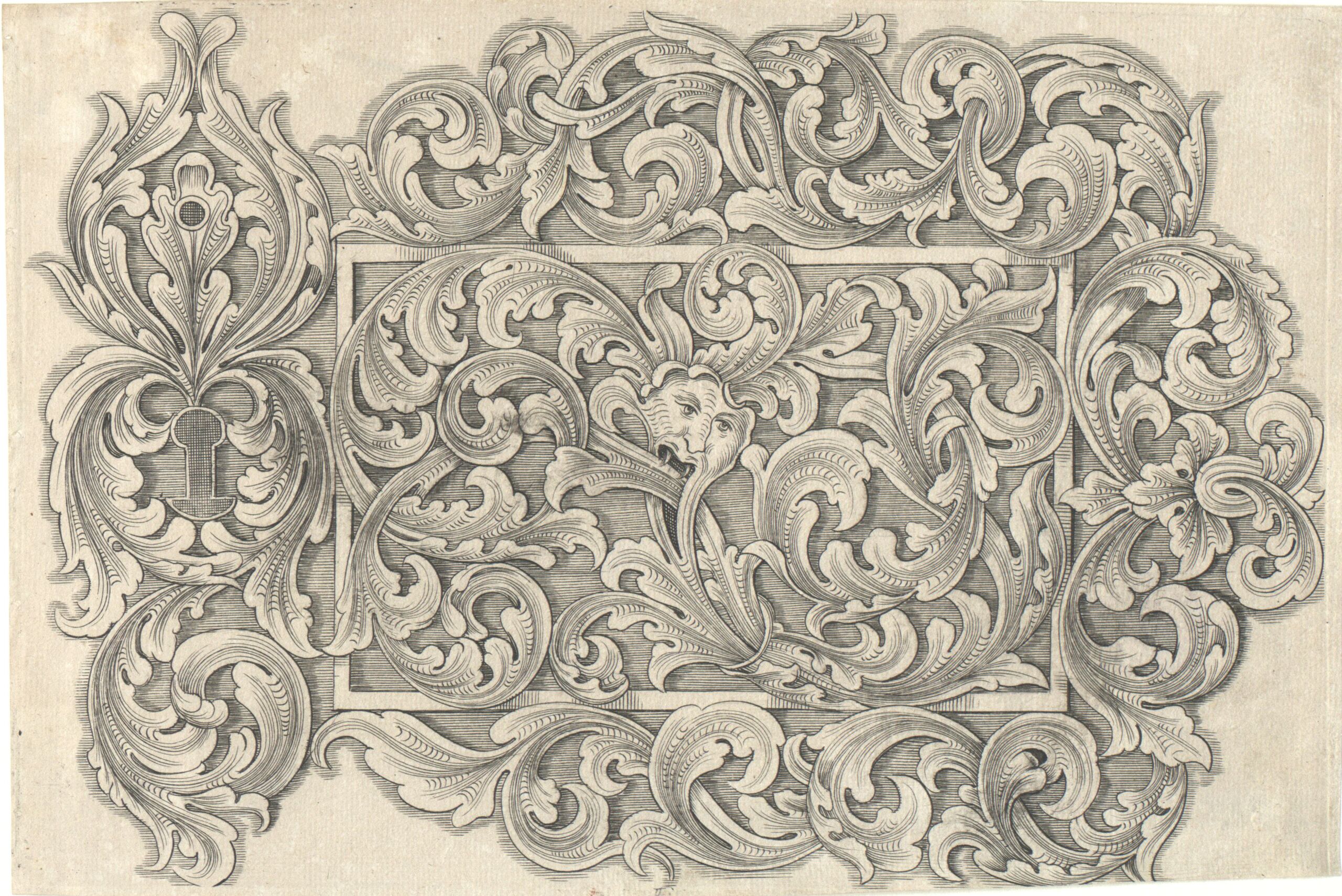 Ornamentstich, Türbeschlag, Blatt aus der Folge „Reiß= Büchlein Heinrich Ölckers Bürger und Hoff= Schloßers in Spremberg“, herausgegeben von J. C. Weigel, Heinrich Oelcker, MAK Inv.nr. KI 2913-5