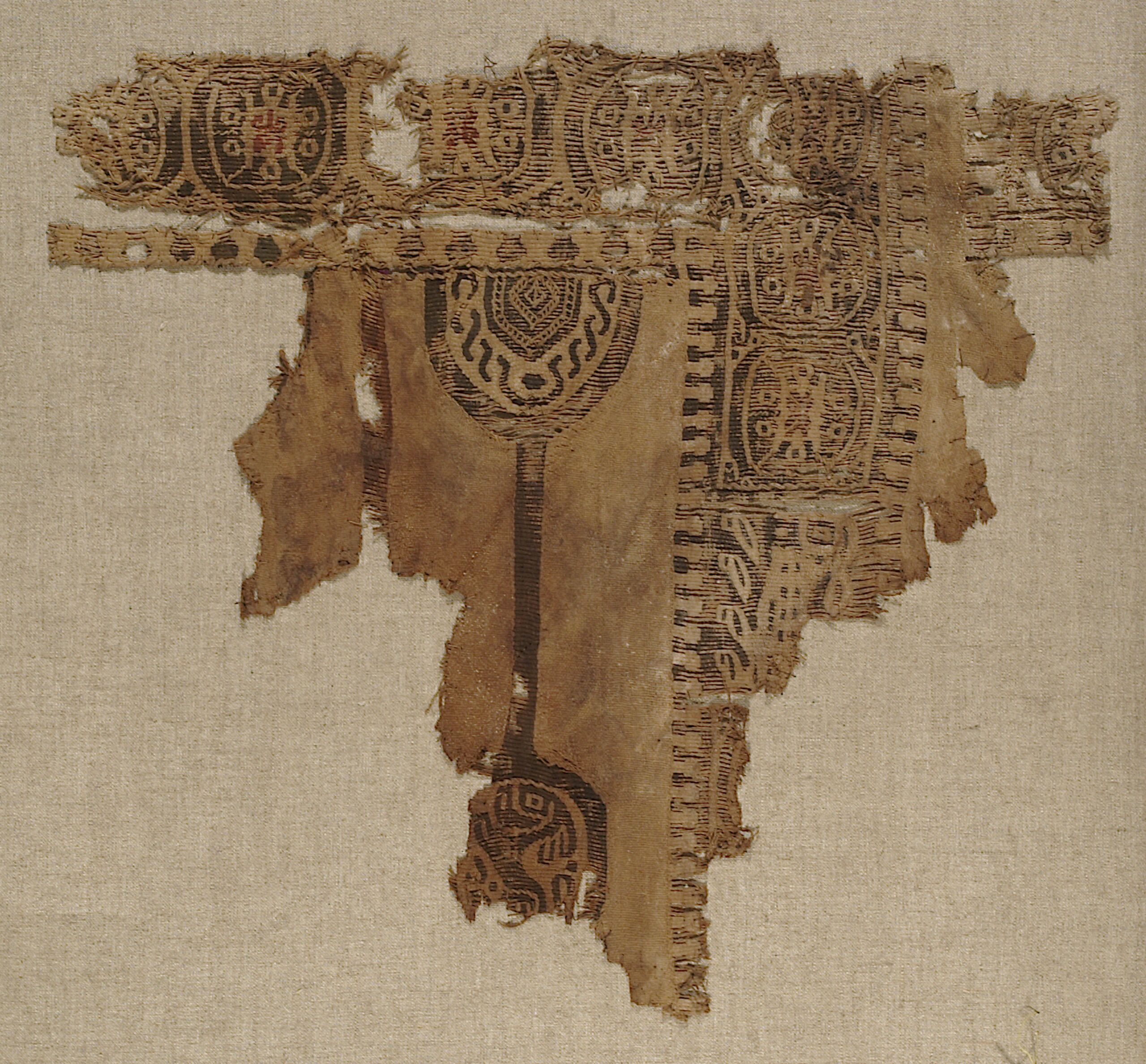 • Tunikafragment mit winkelförmigem Zierstreifen und Anhänger (Sigillum) mit Steg; Medaillons mit stilisierten Tieren und Rosetten (deskriptiver Titel)