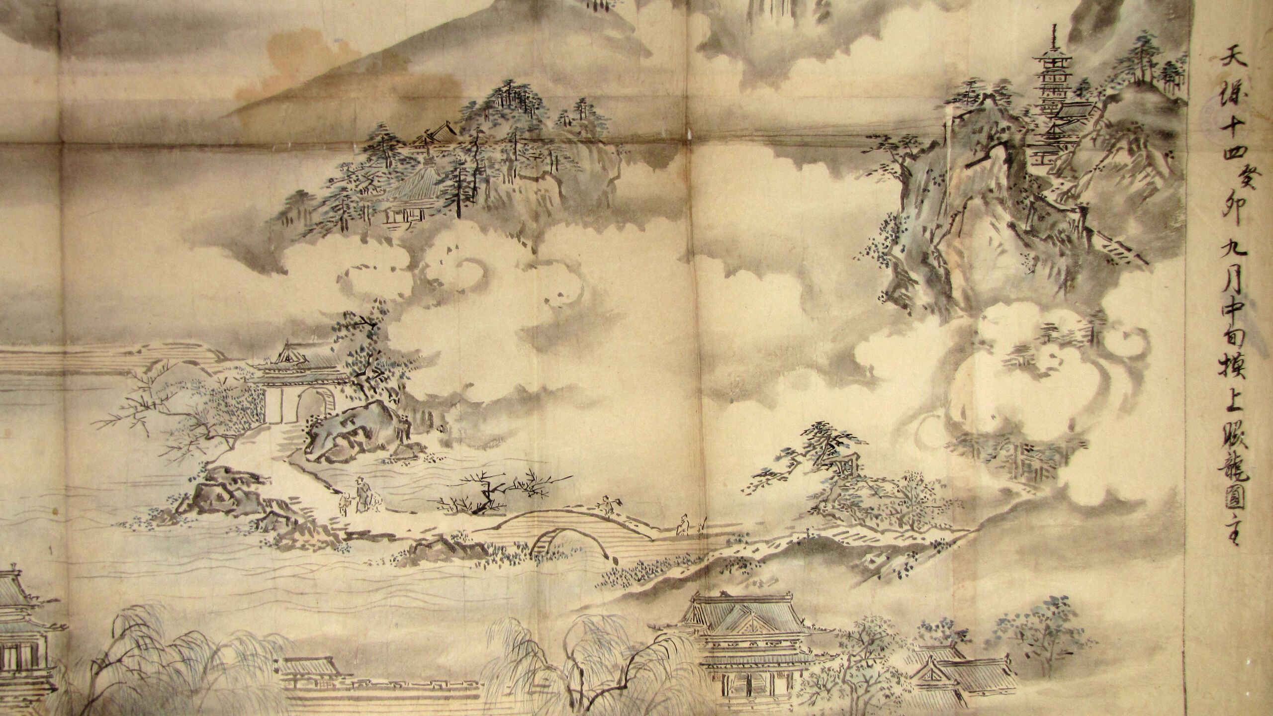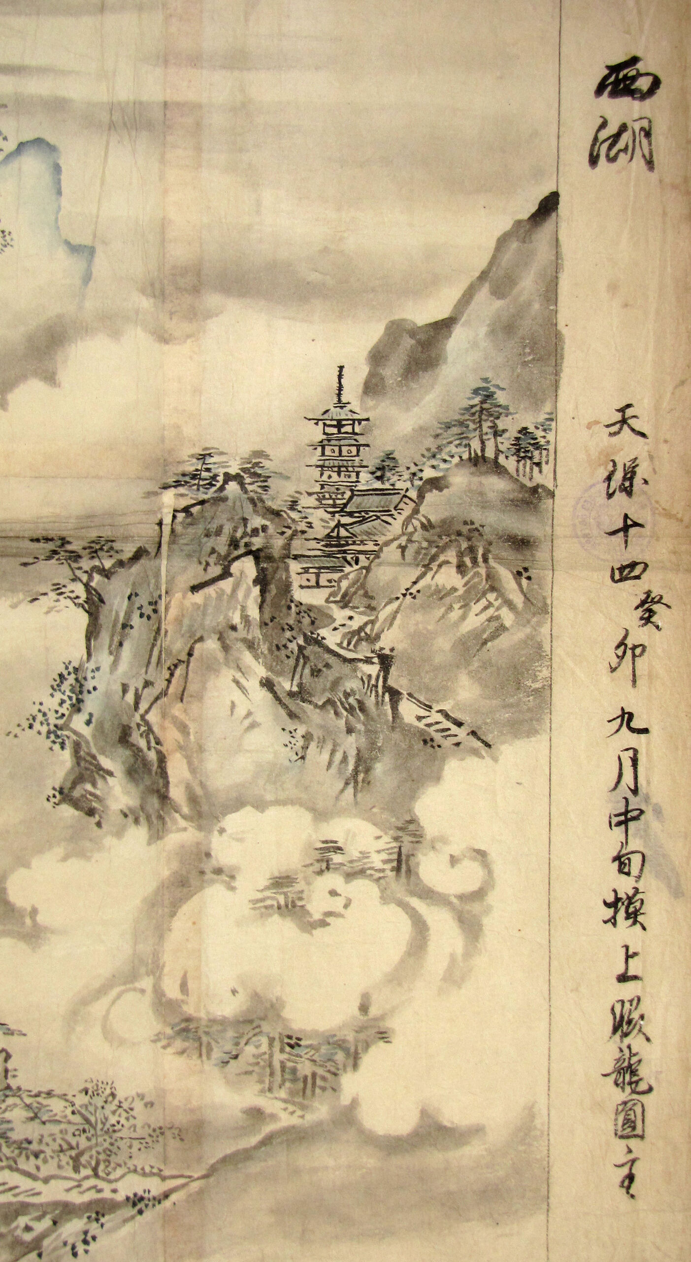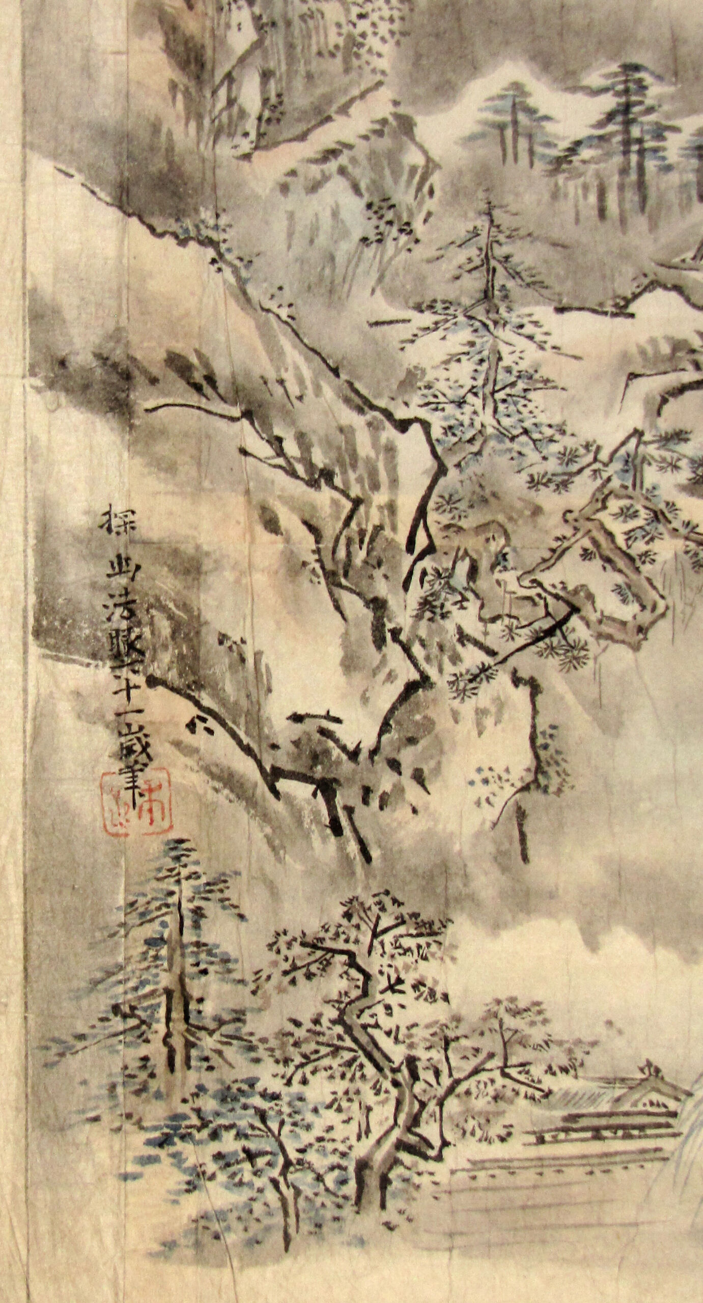 • Text im Bild: links: gemalt nach Tan'yū Hōgen im Alter von 61 rechts: Saiko(?), Tenpō 14, Jahr des jüngeren Wassers und des Hasen, Mitte September kopiert, ein Bild von Jō(?)Ganryū(?).+(?)