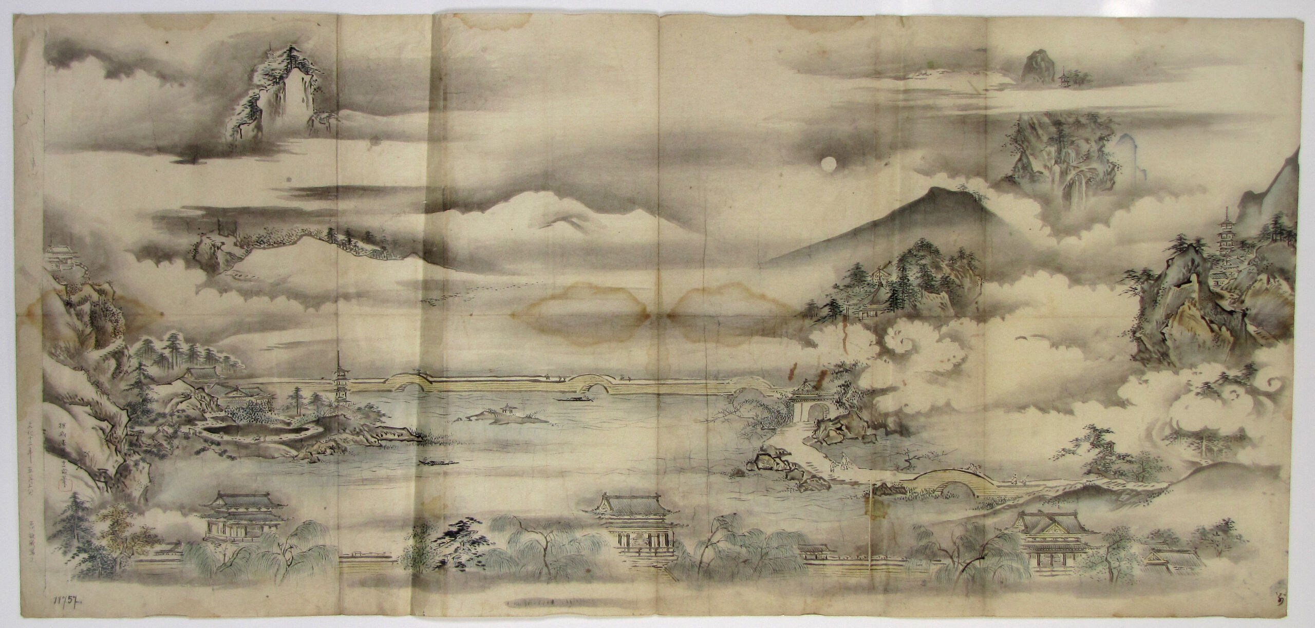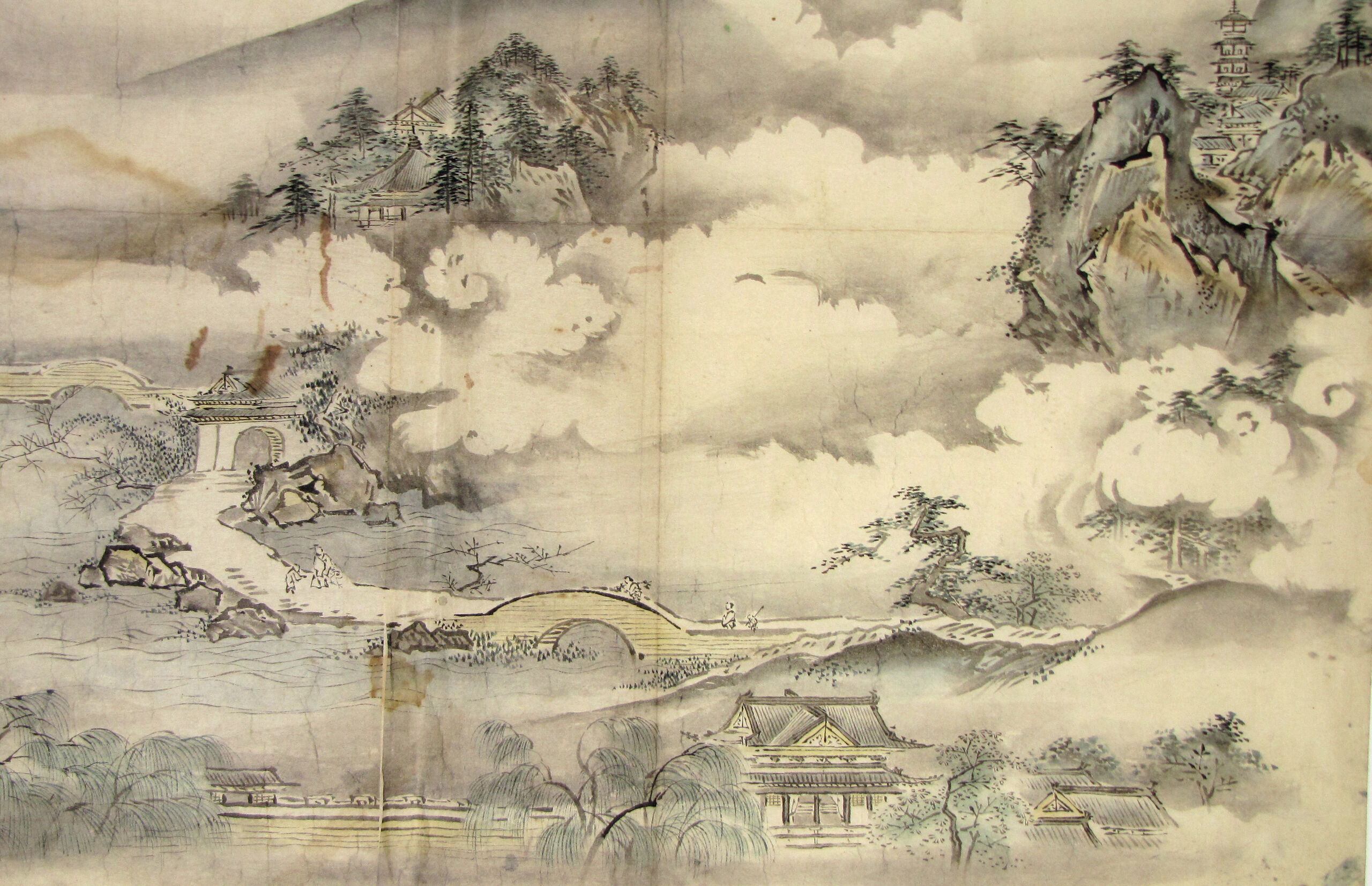 Uferlandschaft mit Häusern, Pagode und Brücke. Im Hintergrund: Berge in den Wolken und Vollmond