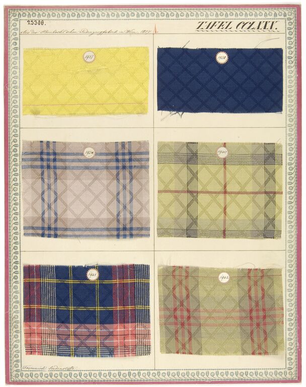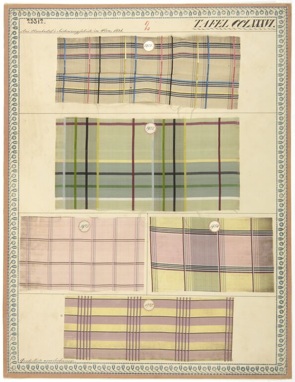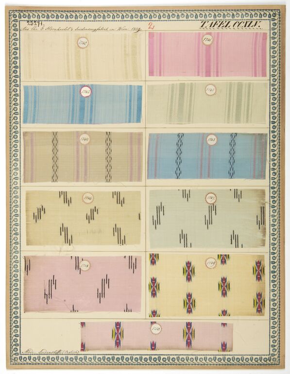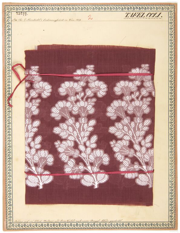 - Beschriftung (Vorderseite) : Aus der Hornbostl'schen Seidenzeugfabrik in Wien 1827. / Ungeschnittene Sammte.