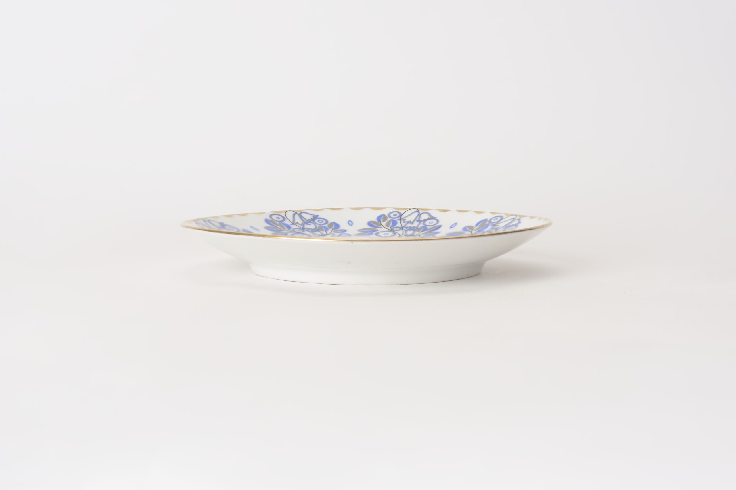 Untertasse, Porzellan, weißer Scherben, gedreht, glänzend, transparent glasiert, gemalter Aufglasurdekor in Blau, Grau und Schwarz, Blatt- und Blütenflächen, Goldstaffage