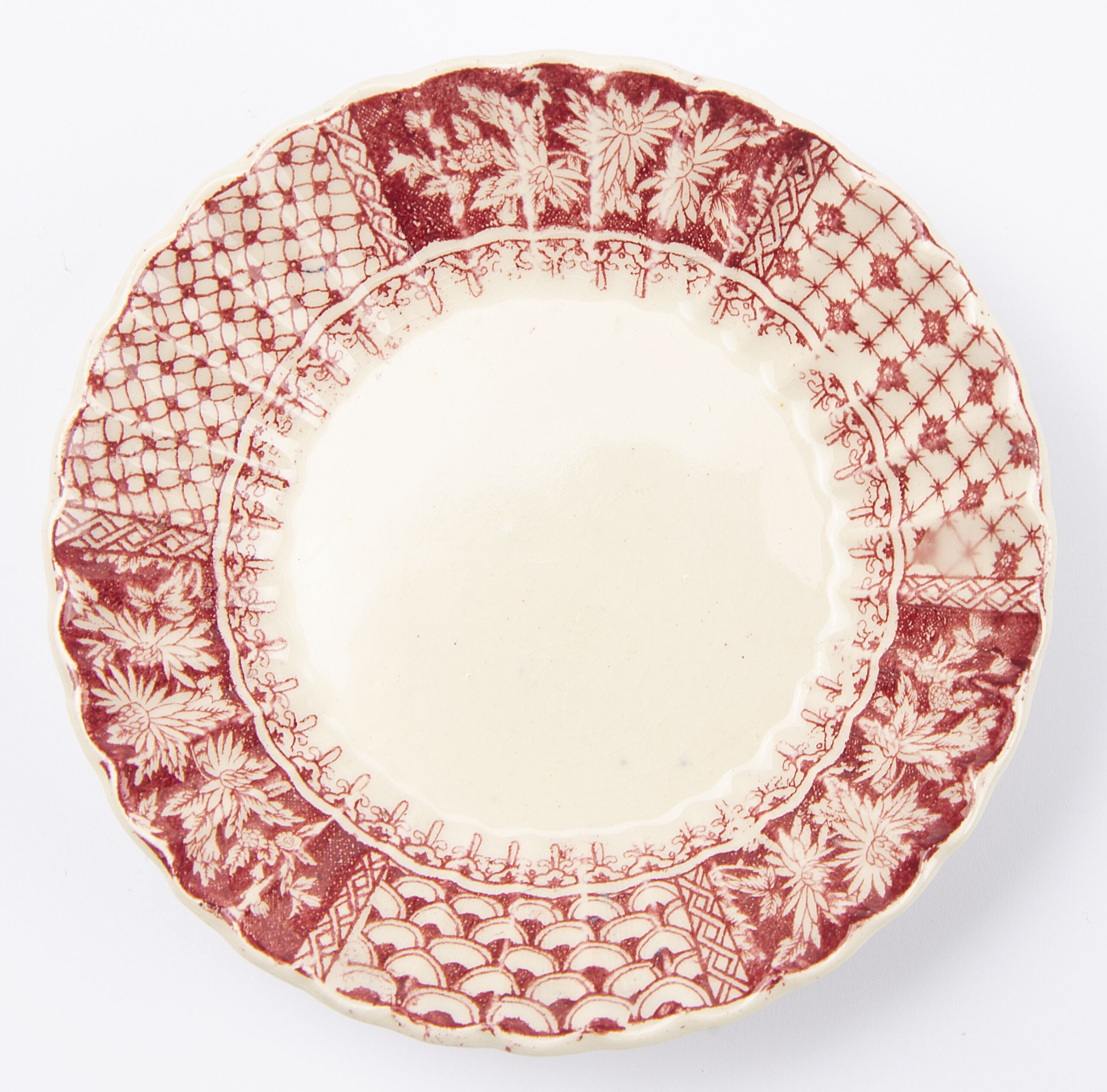 Englisches Sevice, Stoke on Trent, W.T.Copeland, beigefarbener Scherben, gewellte Wandung, transparent glasiert mit rotem Transferdruck-Dekor