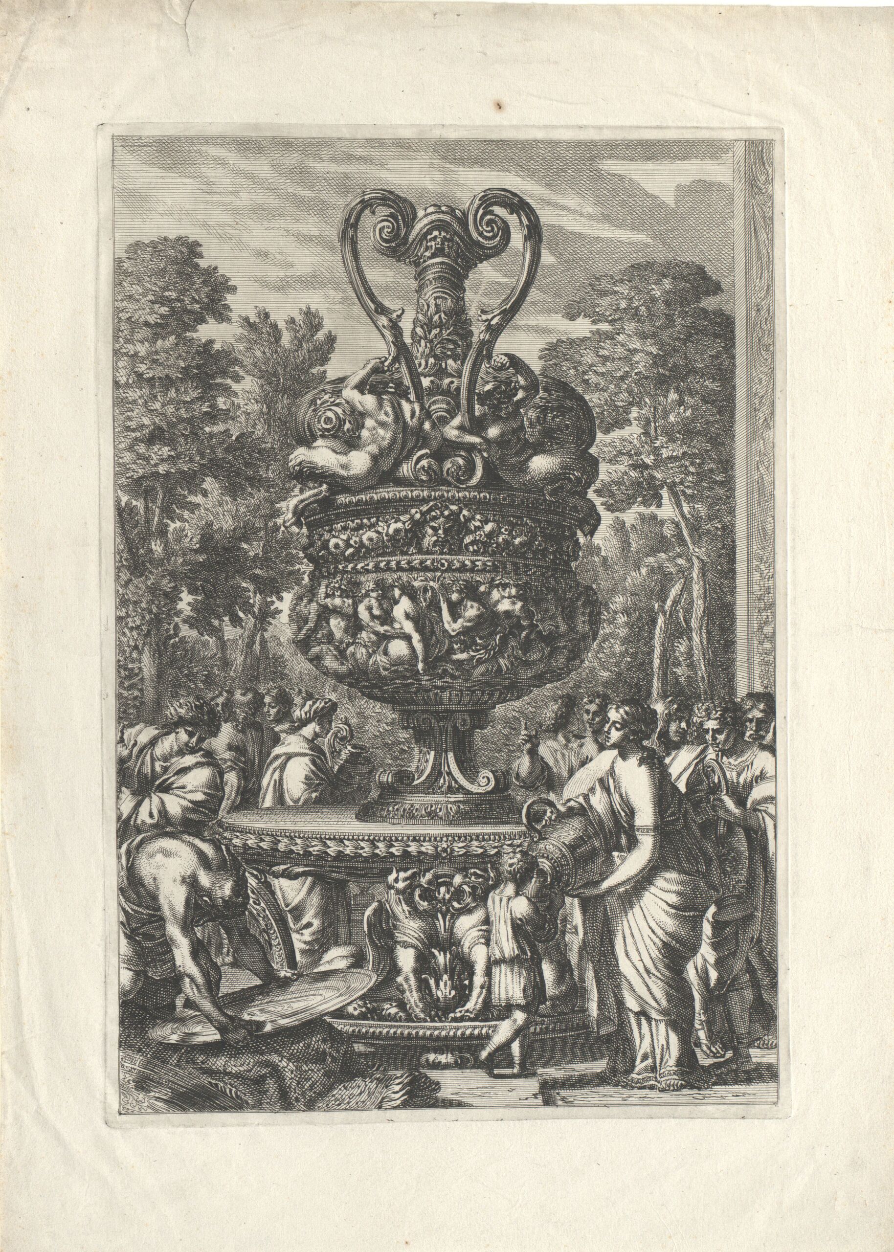 Ornamentstich, Vase, im Hintergrund eine historische Darstellung, Jean Lepautre, MAK Inv.nr. KI 1-658-164