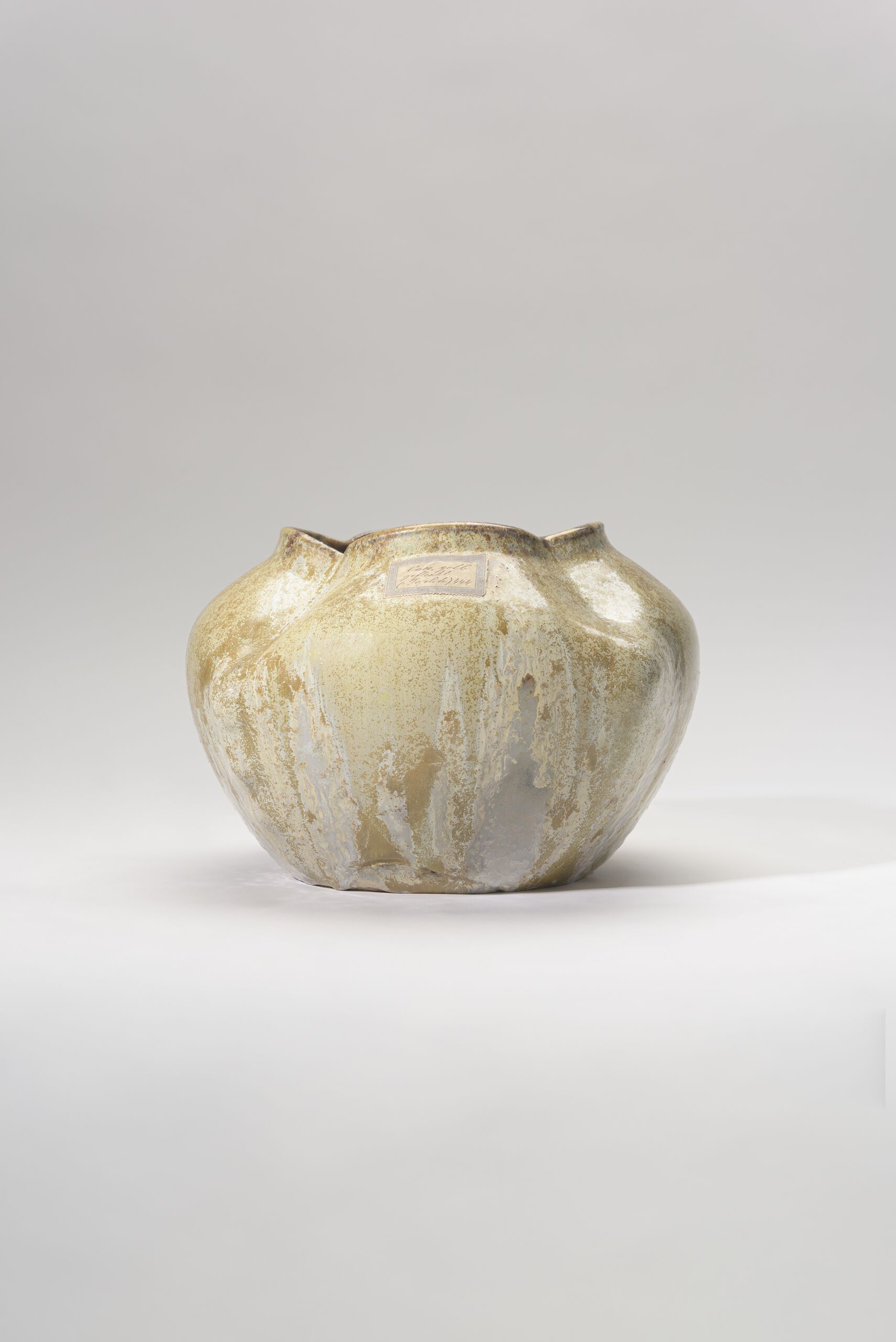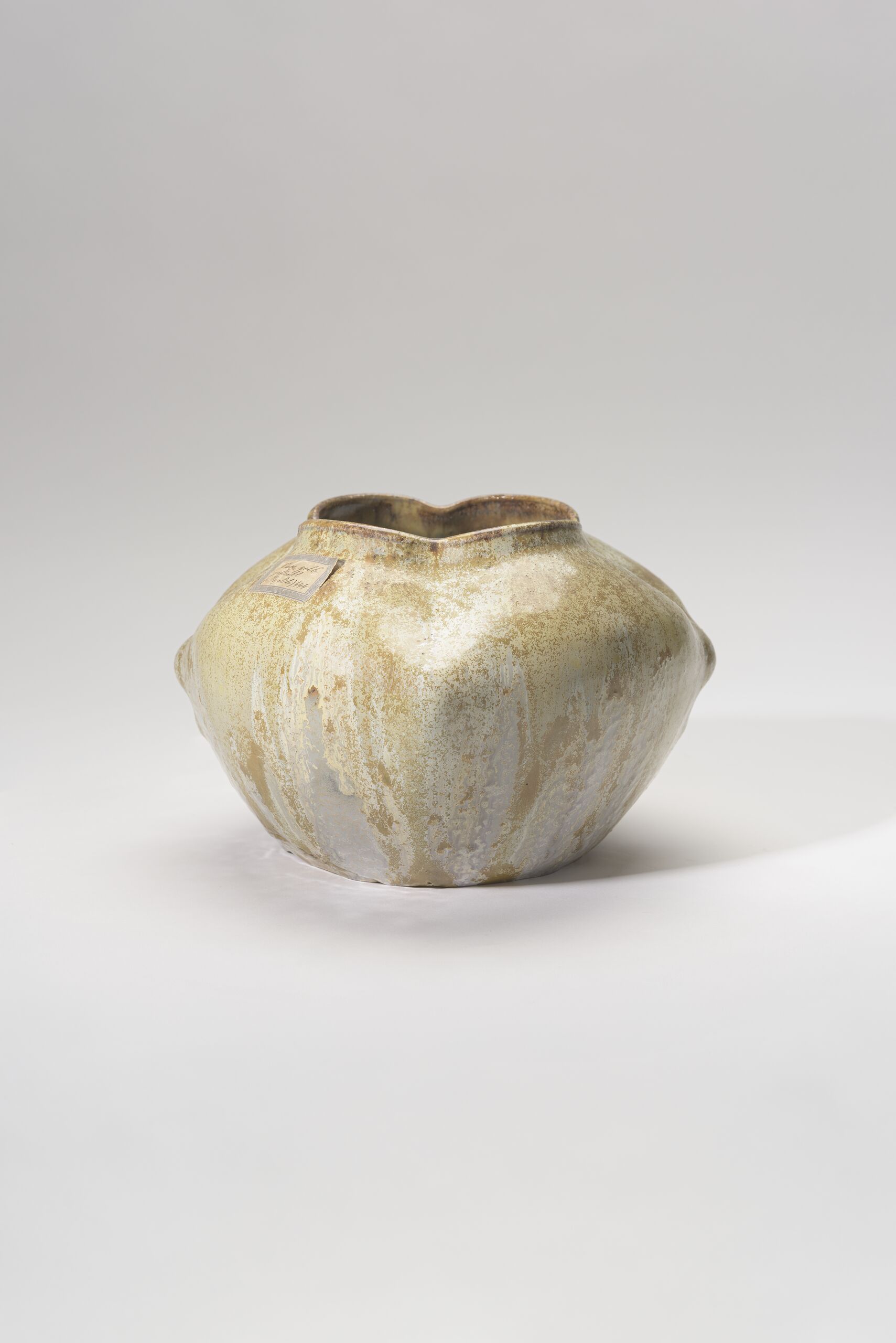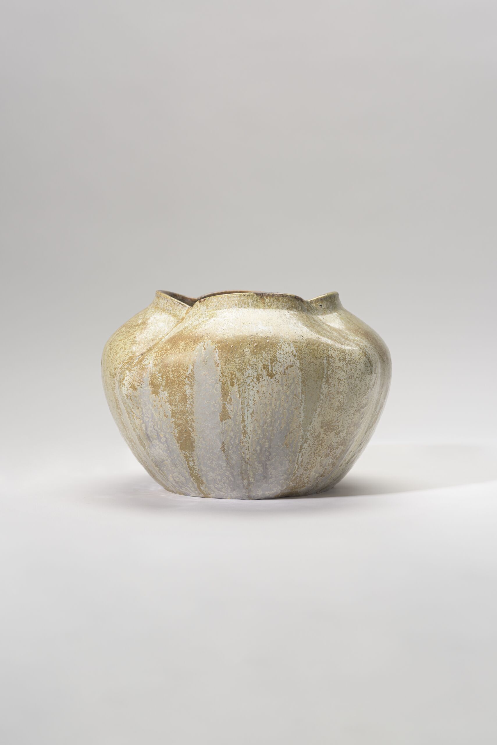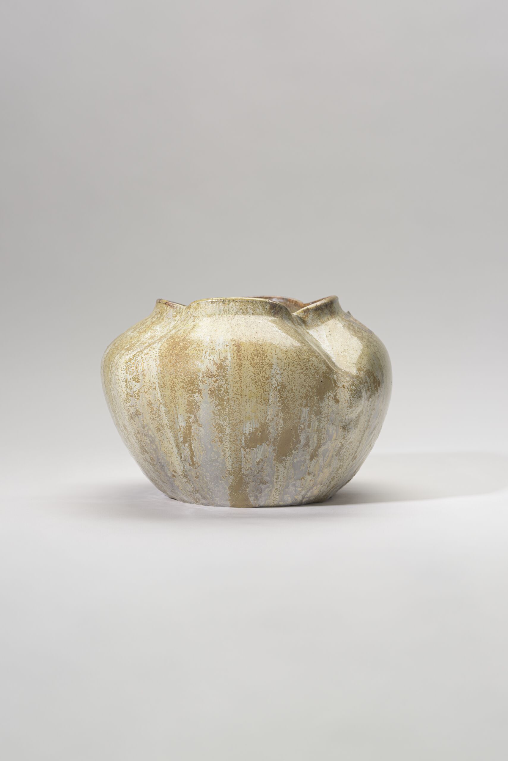 bauchige Vase mit vierpassähnlicher Öffnung, gelb-olivefarbene Laufglasur, innen dicke/deckende graue Glasur