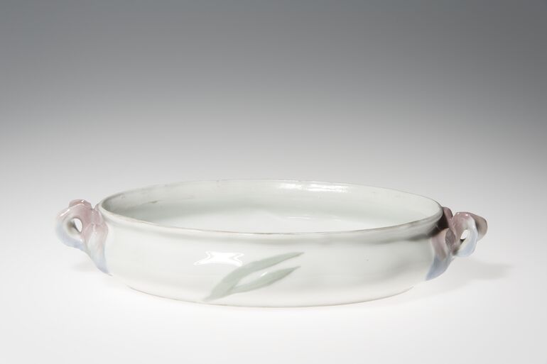 Vase, Porzellan, gegossen, Relief übergehend in reine Malerei, grüne Schlingenblätter (Erbsenblätter), von oben bis zur Mitte pfirsichblütenfärbiger Hintergrund, kleines gemaltes Insekt in Gold