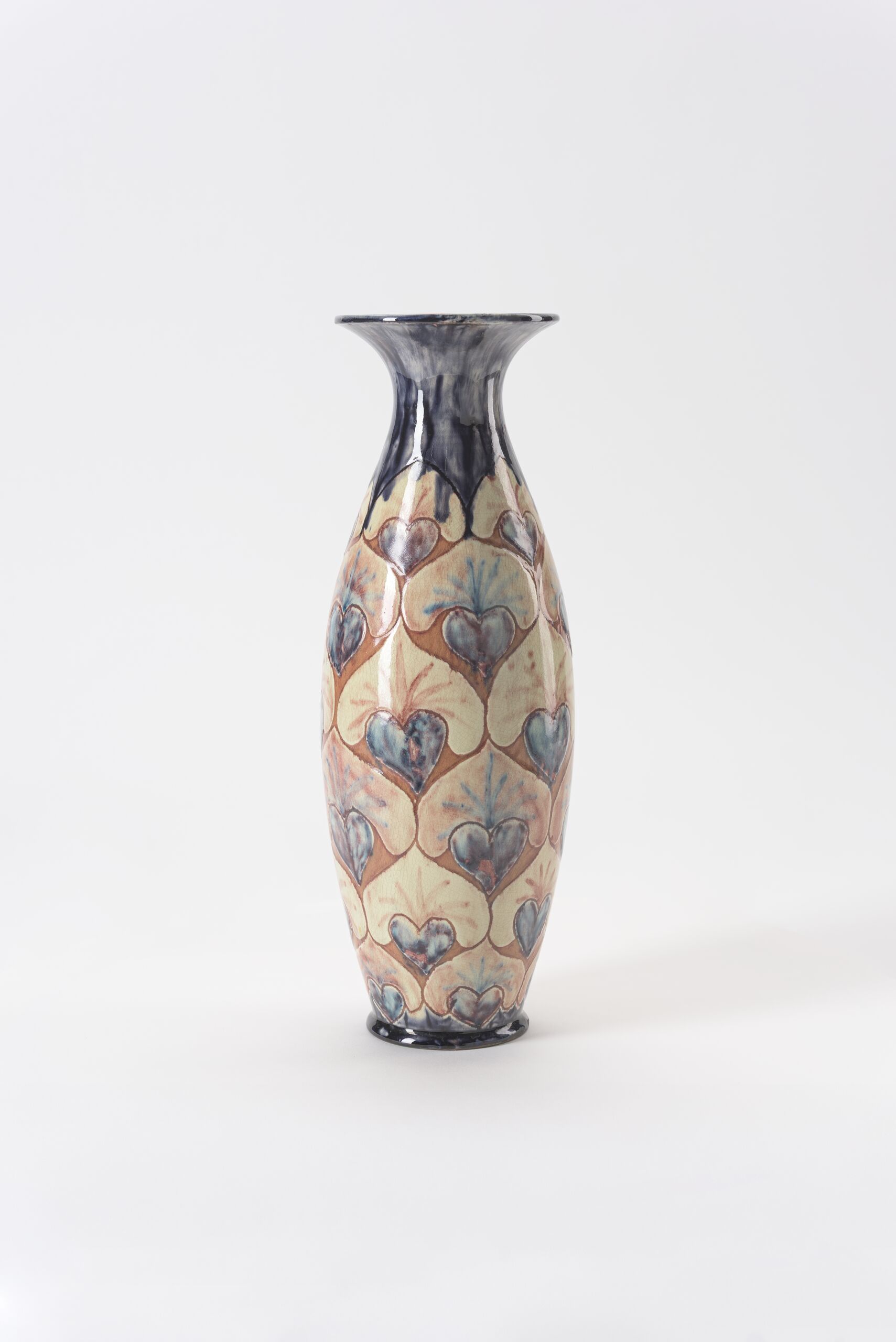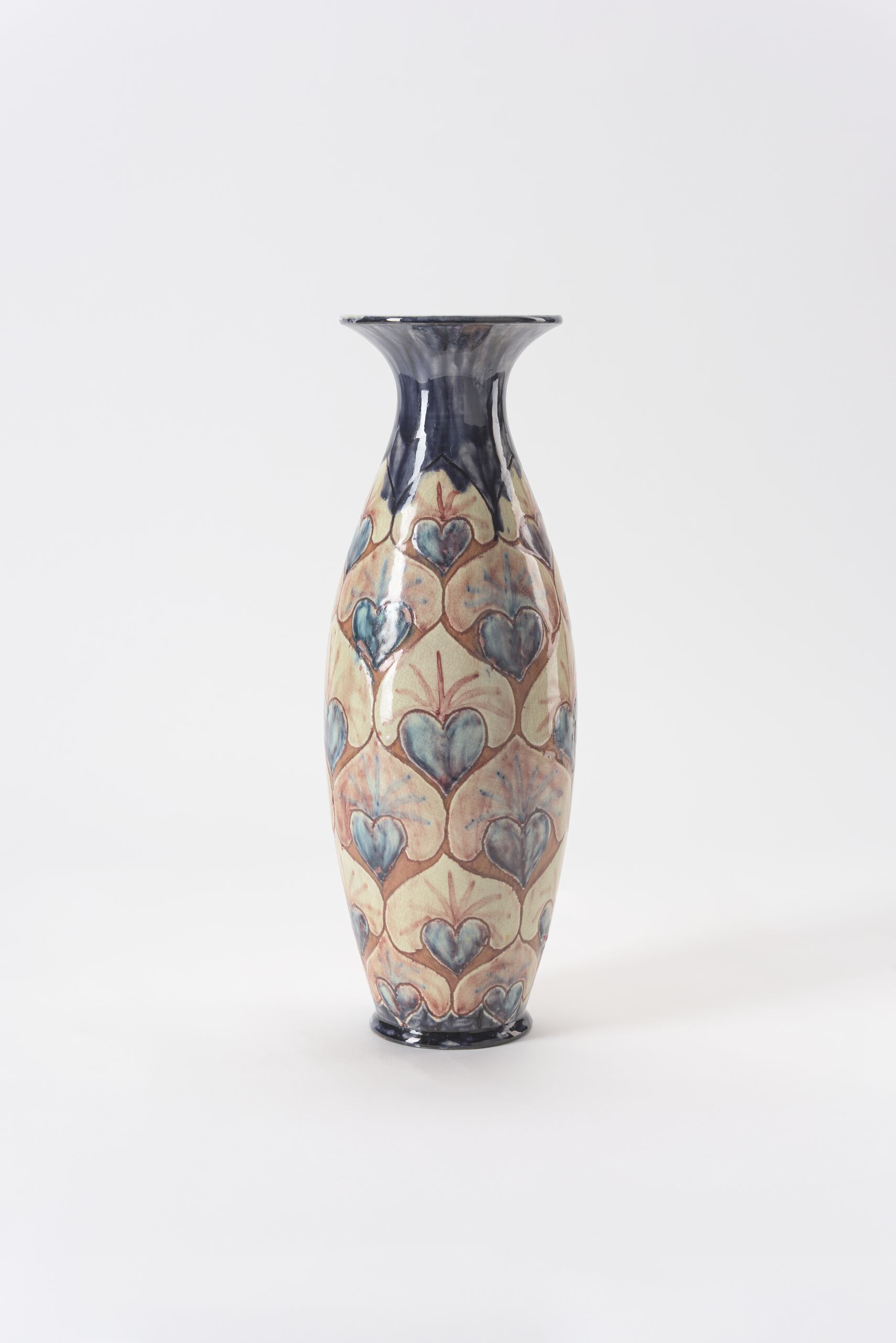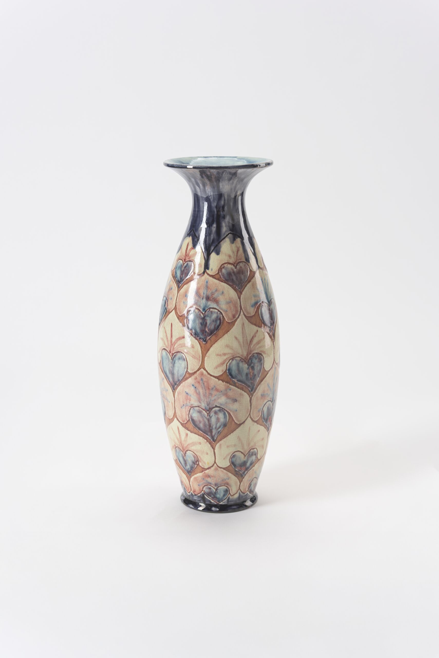 Vase schlanke Form, Ton, roter Scherben, getöpfert, cremefarbene Engobe, geritzt, erhaben dekoriert, mit herzförmigen Blättern, in blau dekoriert, glänzend, transparent glasiert