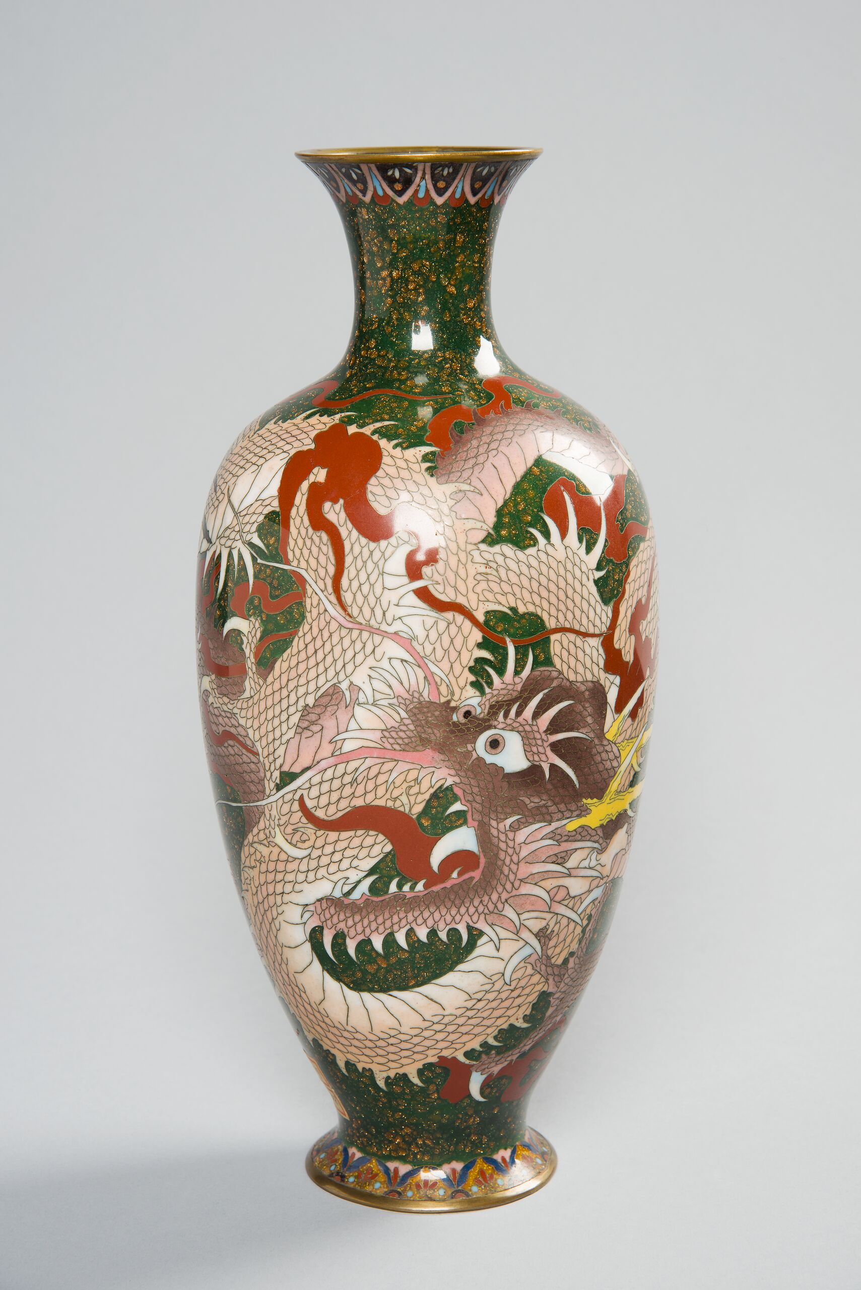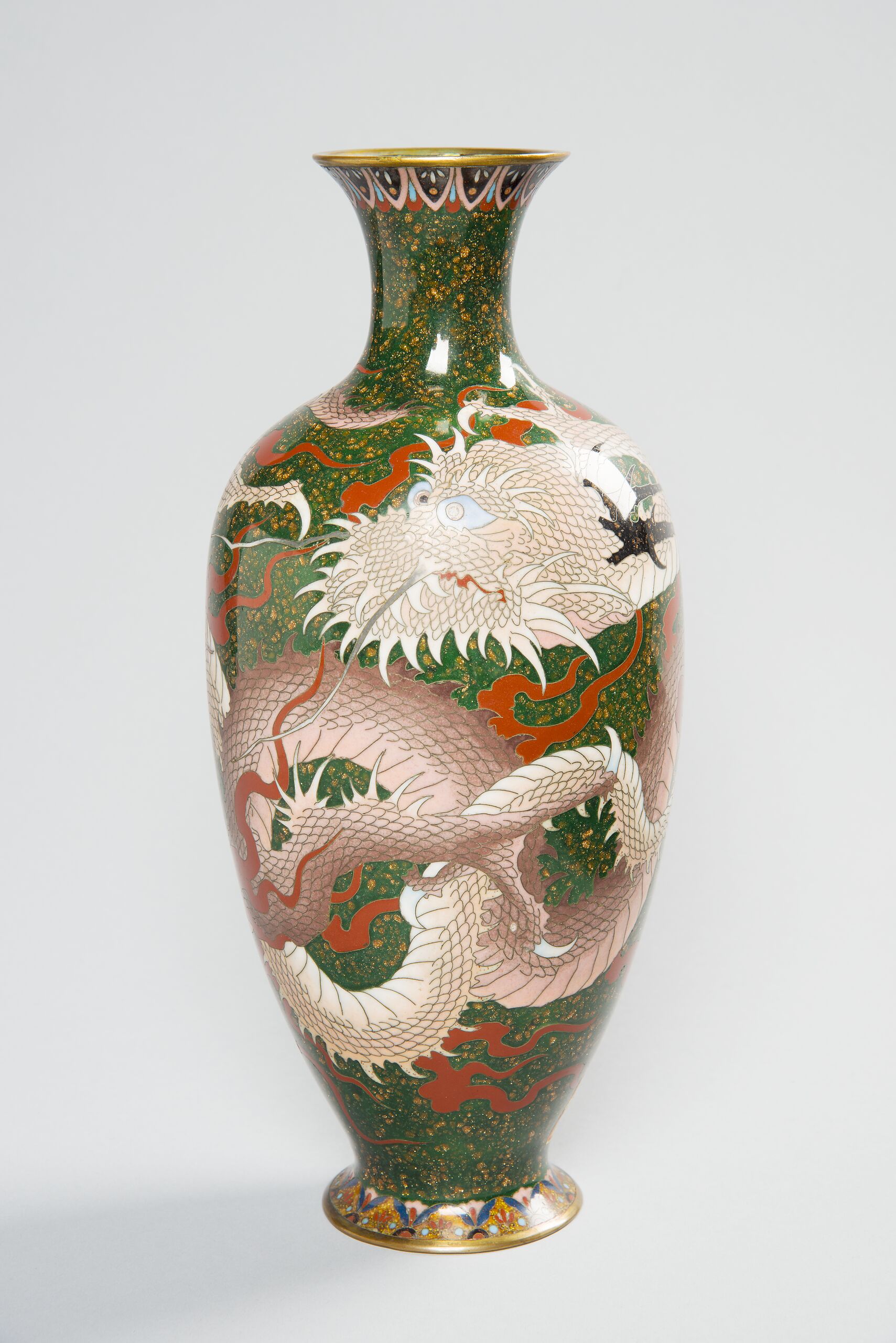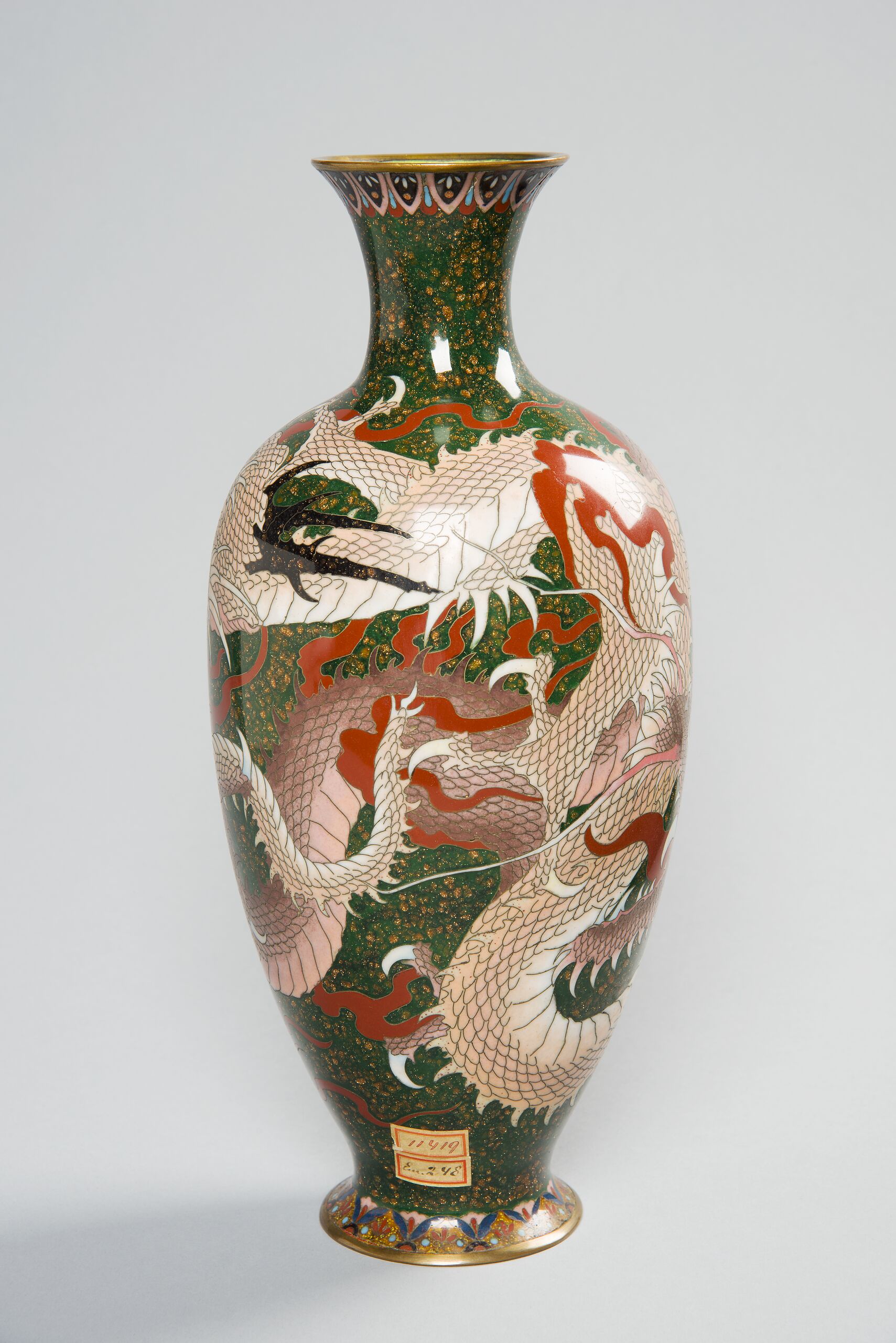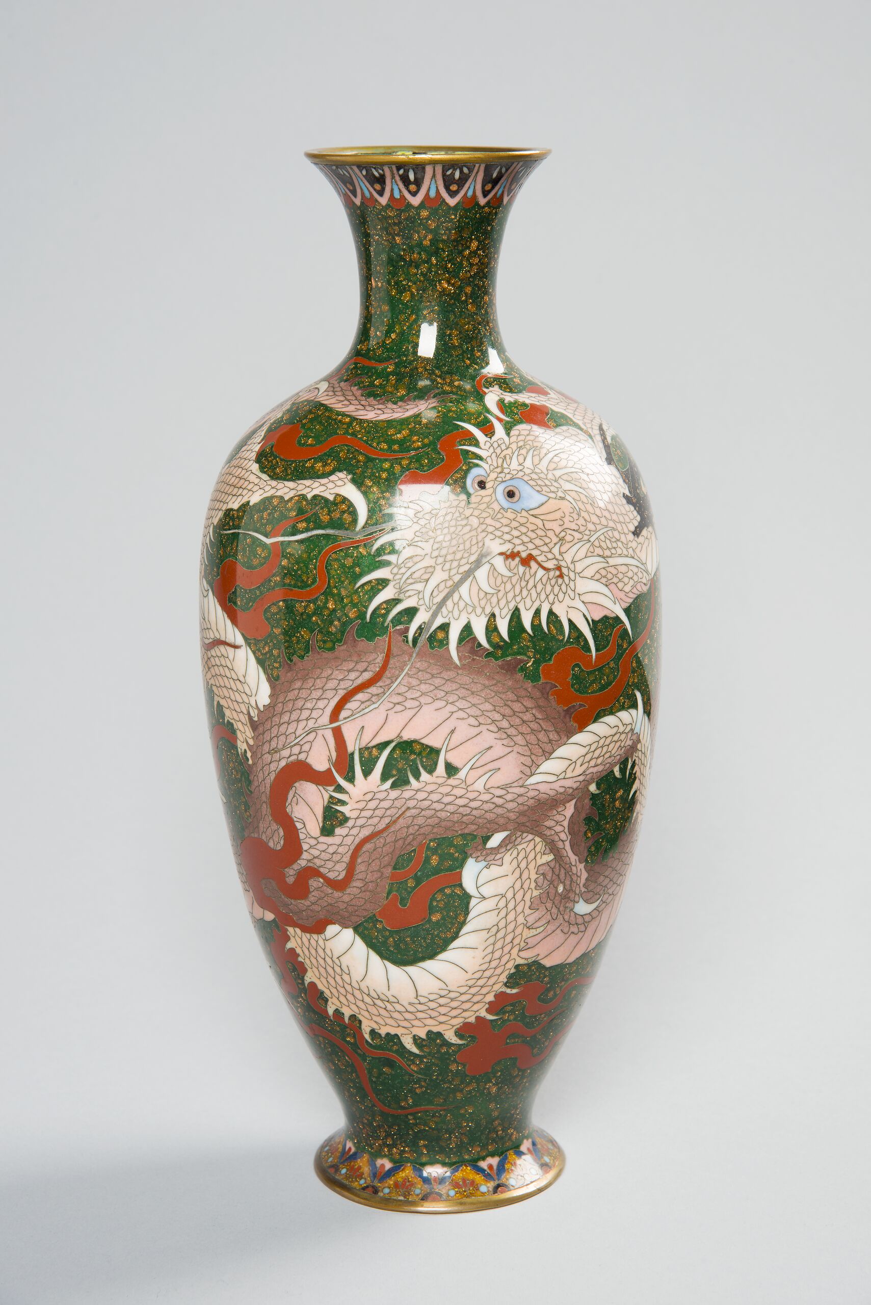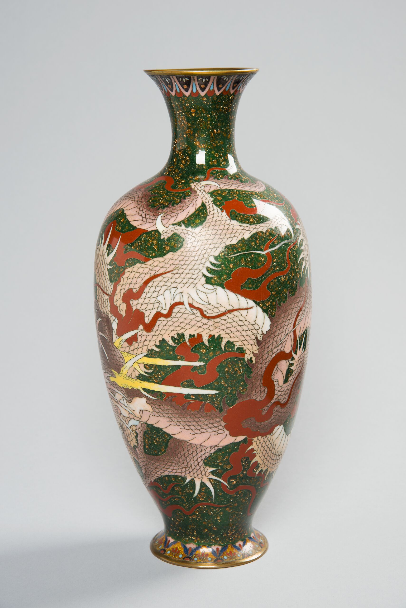 Kupfer mit Dekor in Zellenemail (émail cloisonné) mit Glitzerdekor im Hintergrund