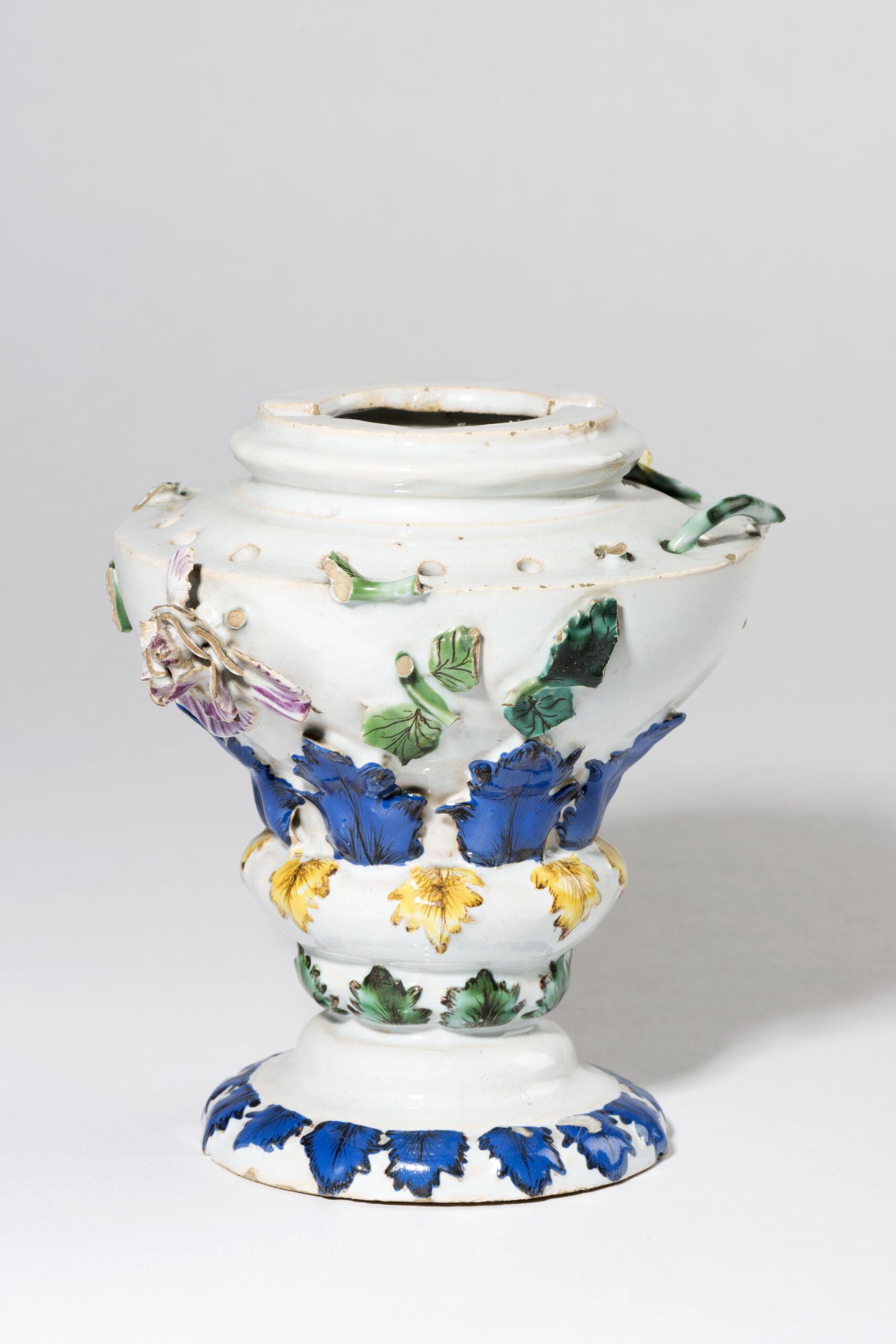 Vase mit bunten Akanthusblattfriesen, Resten von Reliefdekor, auf der Schulter Lochreihe, Deckel fehlt
