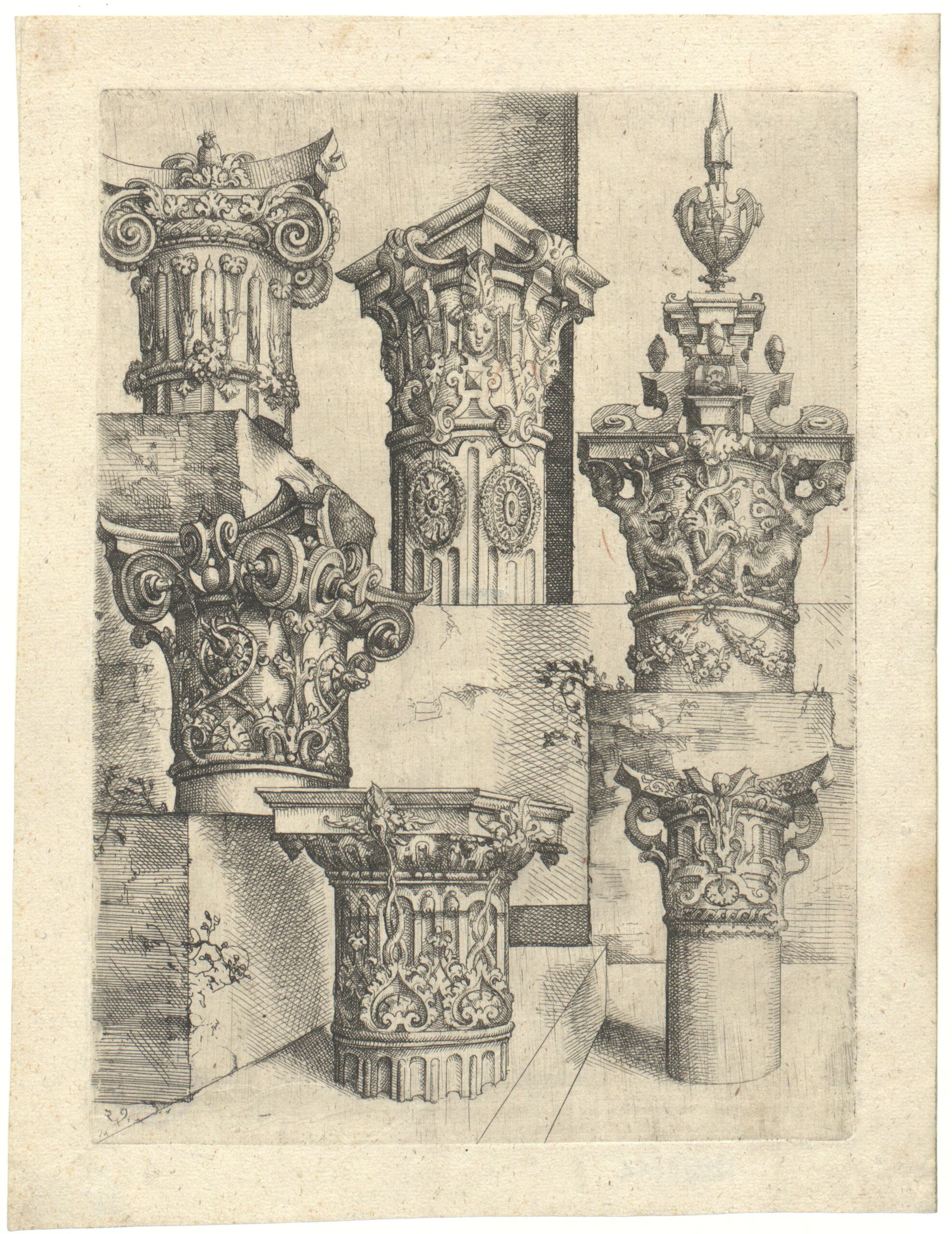 Architekturdarstellung, Verschiedene Kapitelle der Komposit- Ordnung, Blatt 29 aus der Folge „Architectura und Ausztheilung der V Seüln. Das Erst Buch etc.“, Wendel Dietterlin, MAK Inv.nr. KI 1-65-11