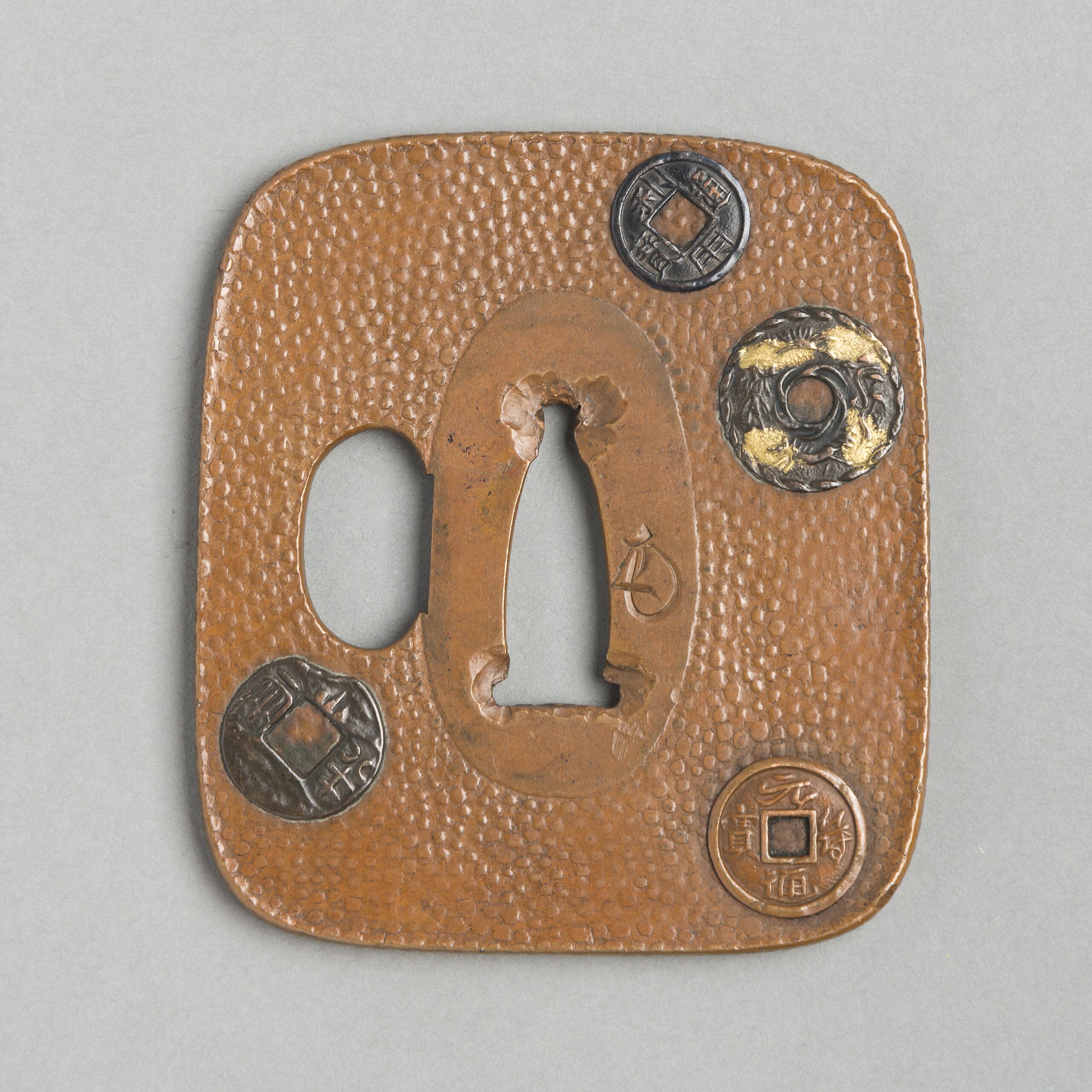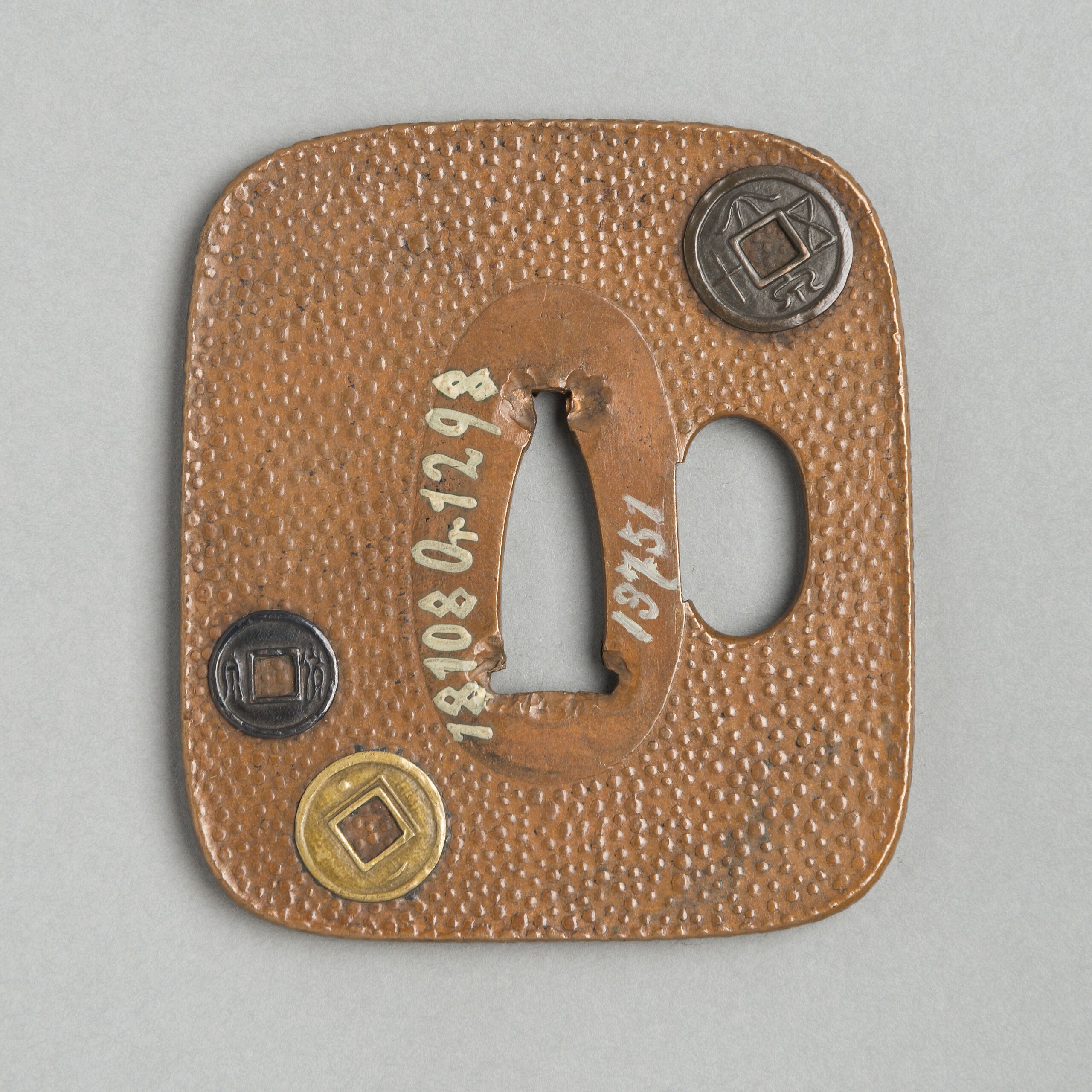 Fläche: Lederimitation mit Einlagen aus verschiedenen Metallen; zu beiden Seiten der länglichen Öffnung in der Mitte (nakagoana 中心穴 oder茎穴) befinden sich die Öffnungen kozukahitsu 小柄櫃 links und kōgaihitsu 笄櫃 rechts.