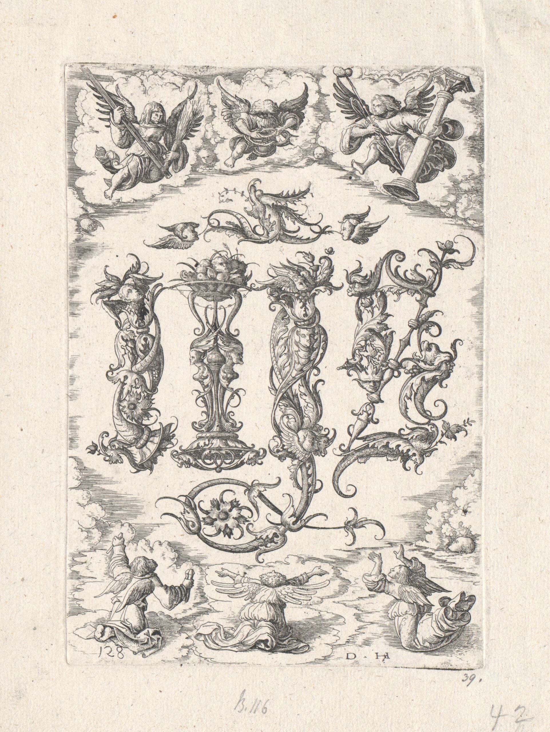 Schriftmusterblatt, Verziertes Monogramm Christi (IHS), mit Funck- Nummer 126, Daniel Hopfer, MAK Inv.nr. KI 1-136
