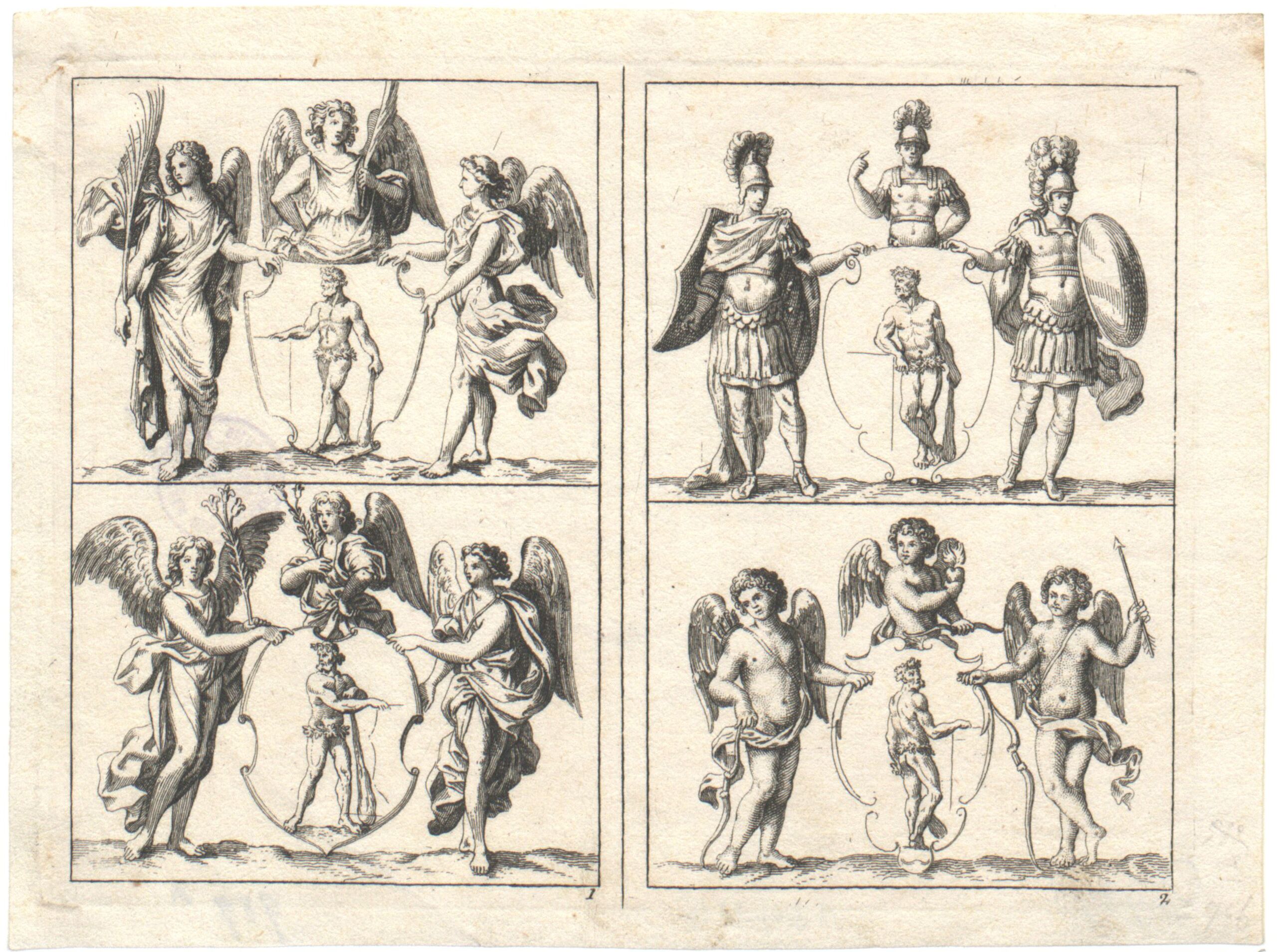 - Vier Figurengruppen für Wappen, Blatt 1 und 2 aus einer Folge von Wappentieren nach P. Schencks Folge „Zoophorus Mirailis etc.“ (vom Bearbeiter vergebener Titel)