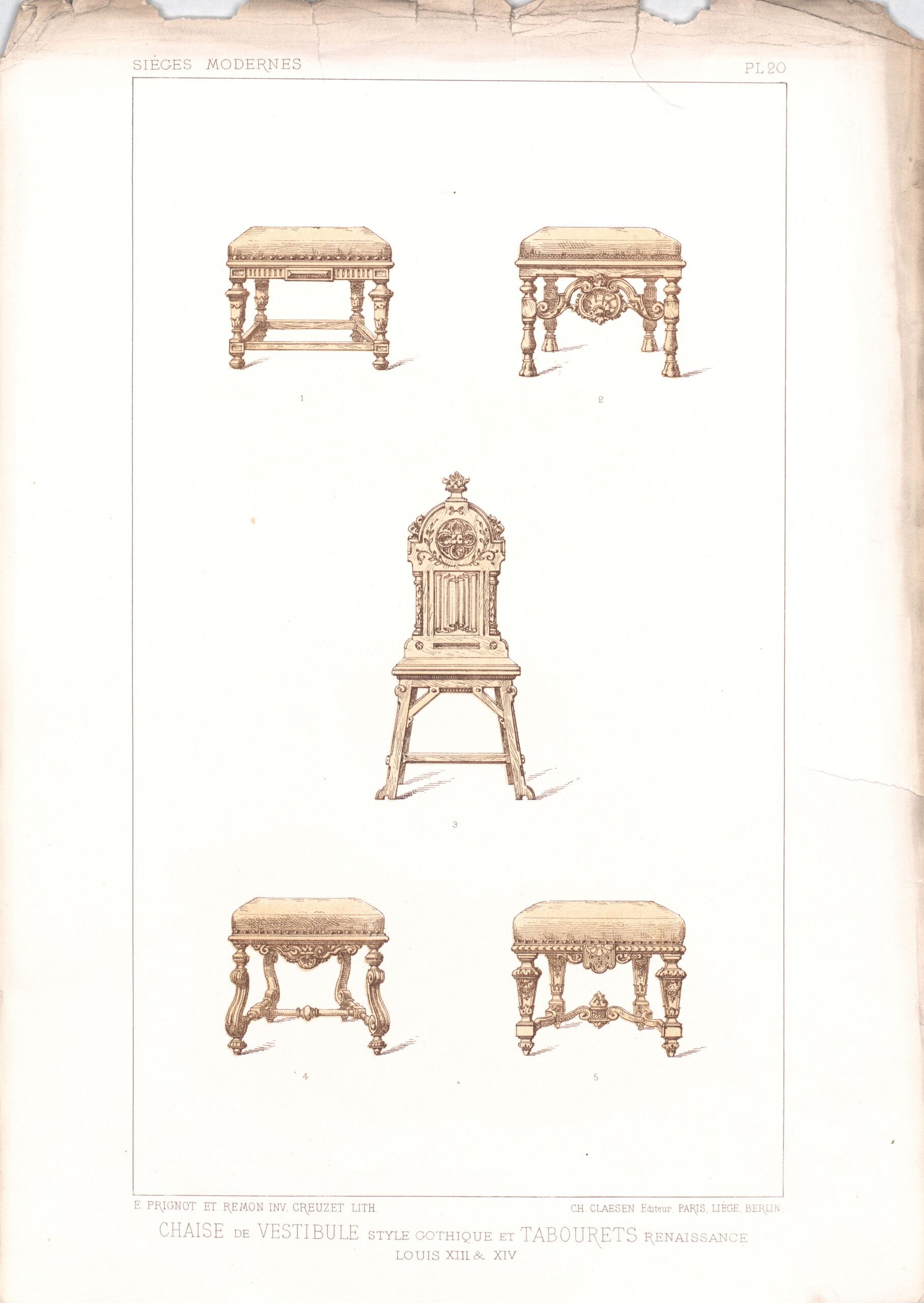 - Text am Objekt: SIÉGES MODERNES PL 20 / CHAISE DE VESTIBULE STYLE GOTHIQUE ET TABOURETS RENAISSANCE/ LOUIS XIII & XIV / E. PRIGNOT ET REMON INV. CREUZET LITH / CH CLAESSEN Editeur PARIS, LIÉGE, BERLIN