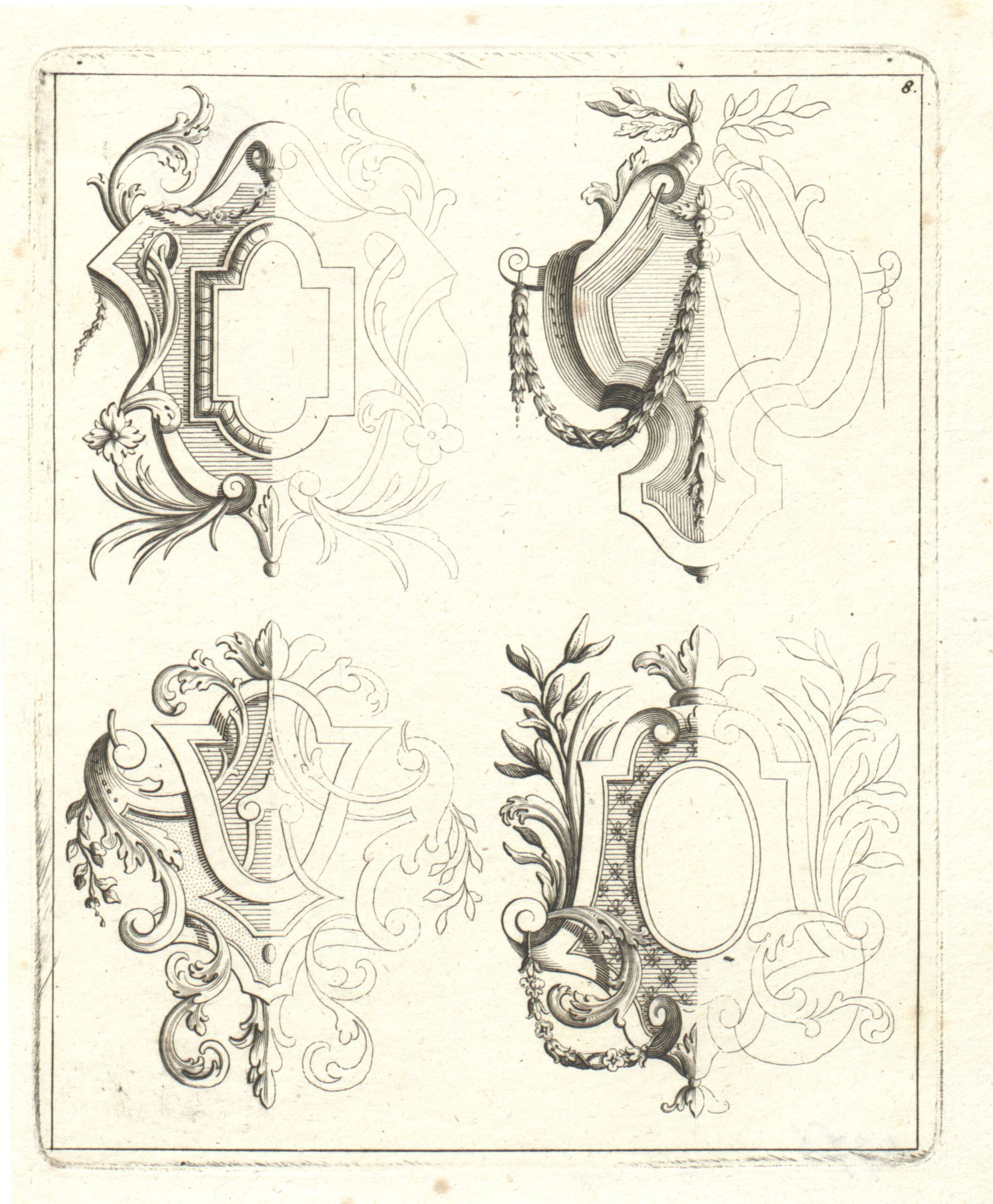 - Vier Kartuschen, Blatt 8 aus der Folge „II Anleitung zu Croteschen Schild und andern Verzierungen wie solche leicht und accorat nachzuzeichnen etc.“, herausgegeben von J. C. Weigel (vom Bearbeiter vergebener Titel)
