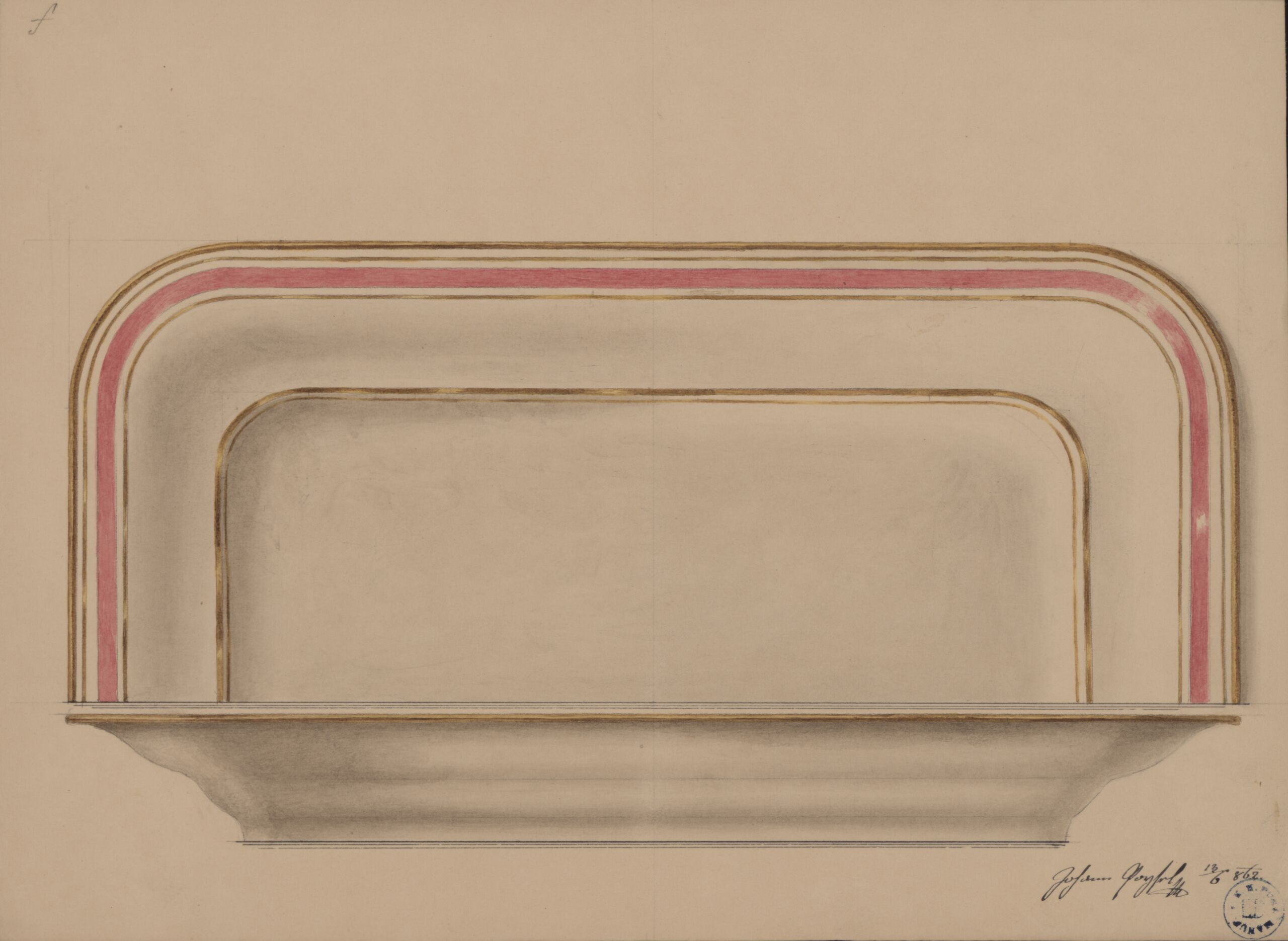 rechteckiger Teller mit abgerundeten Ecken, Ansicht von vorne und von oben, Goldrand am Außen- und Innenrand des Spiegels, rosa Band am Spiegel